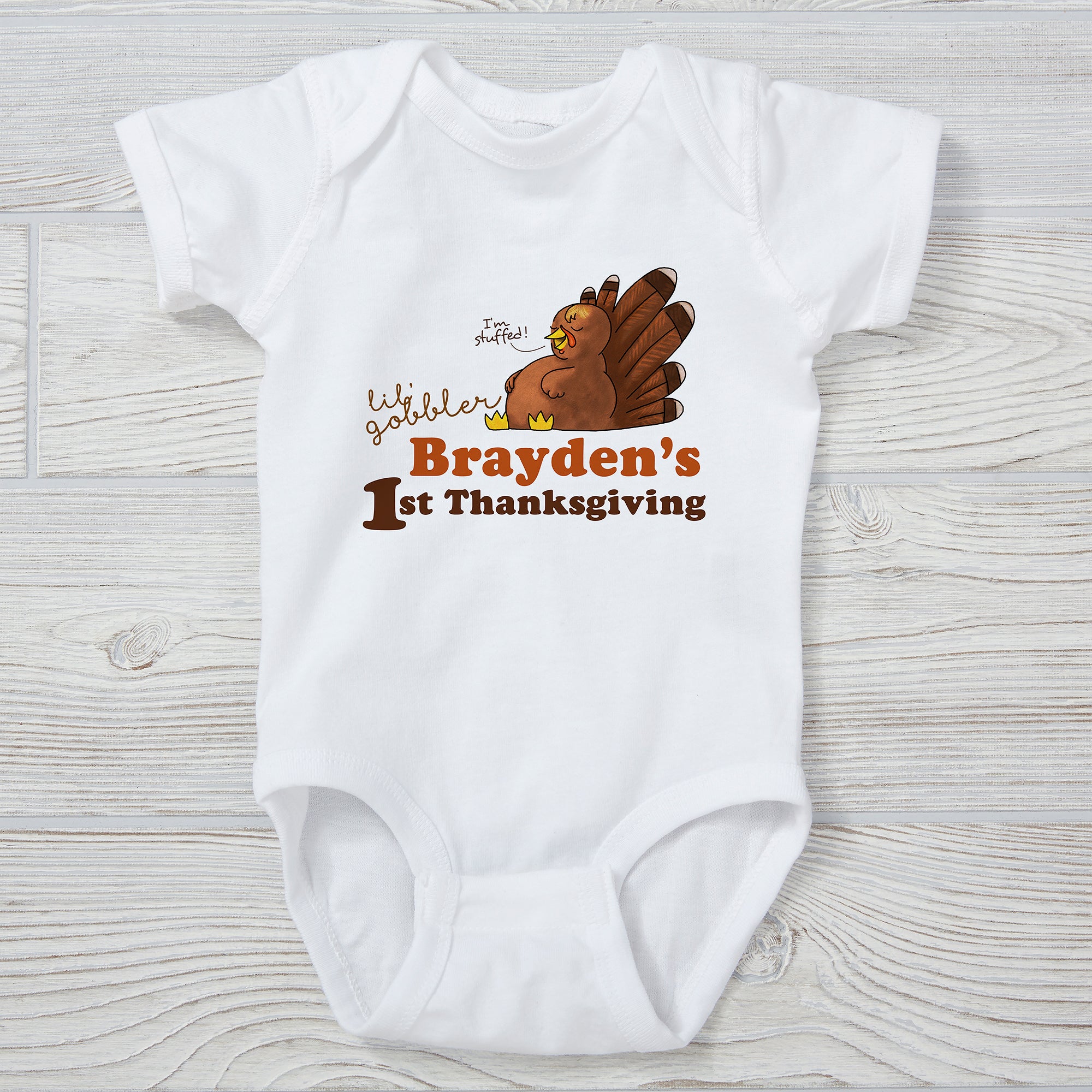 Your Baby's First Thanksgiving is a very memorable occasion. Celebrate in holiday style with our adorable My First Thanksgiving Personalized Baby Clothing.