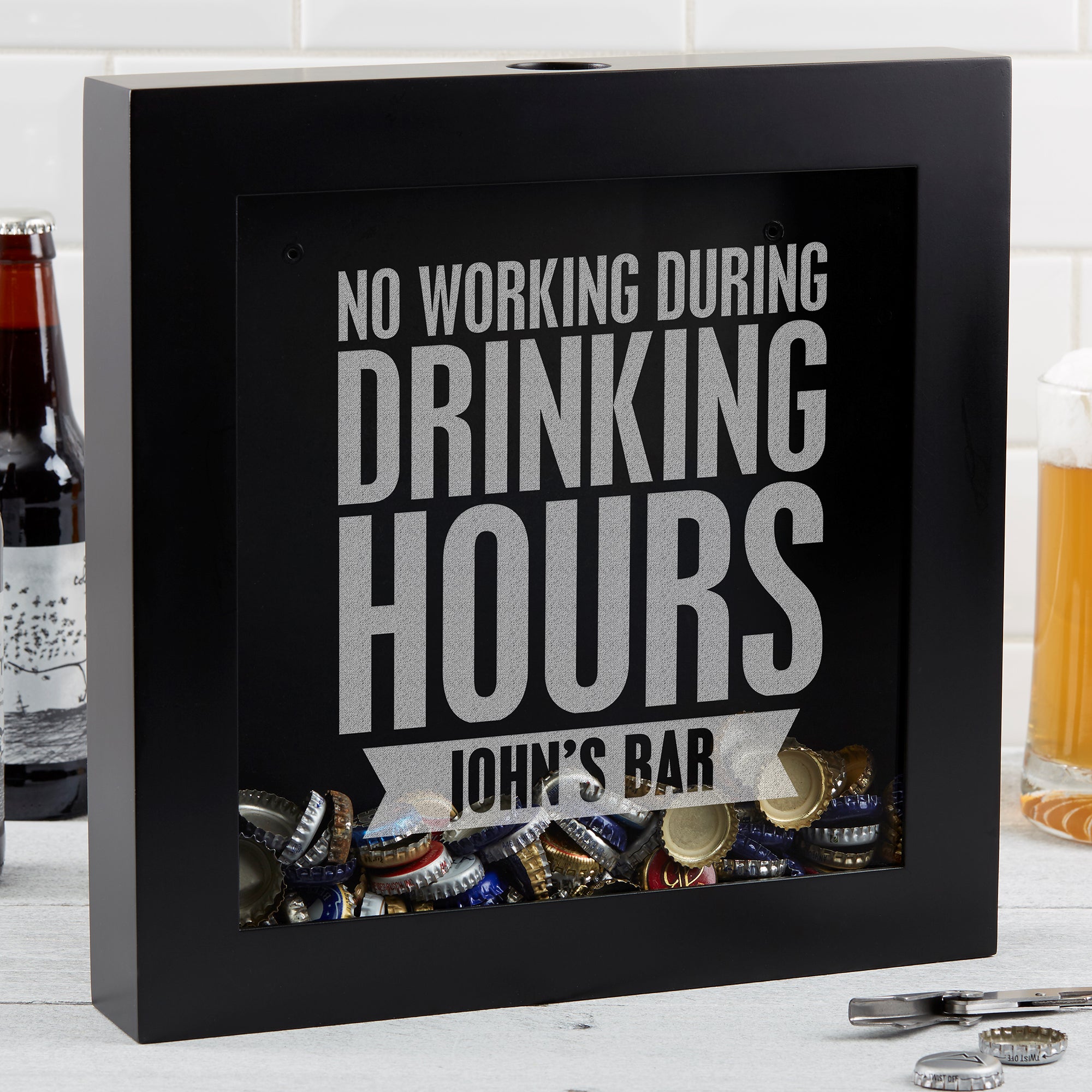 Choose our Beer Quotes Personalized Beer Cap Shadow Box to creatively display and store used beer caps. Great for birthdays, groomsmen, housewarmings and much more; they will be sure to love showing off their drinking accomplishments!