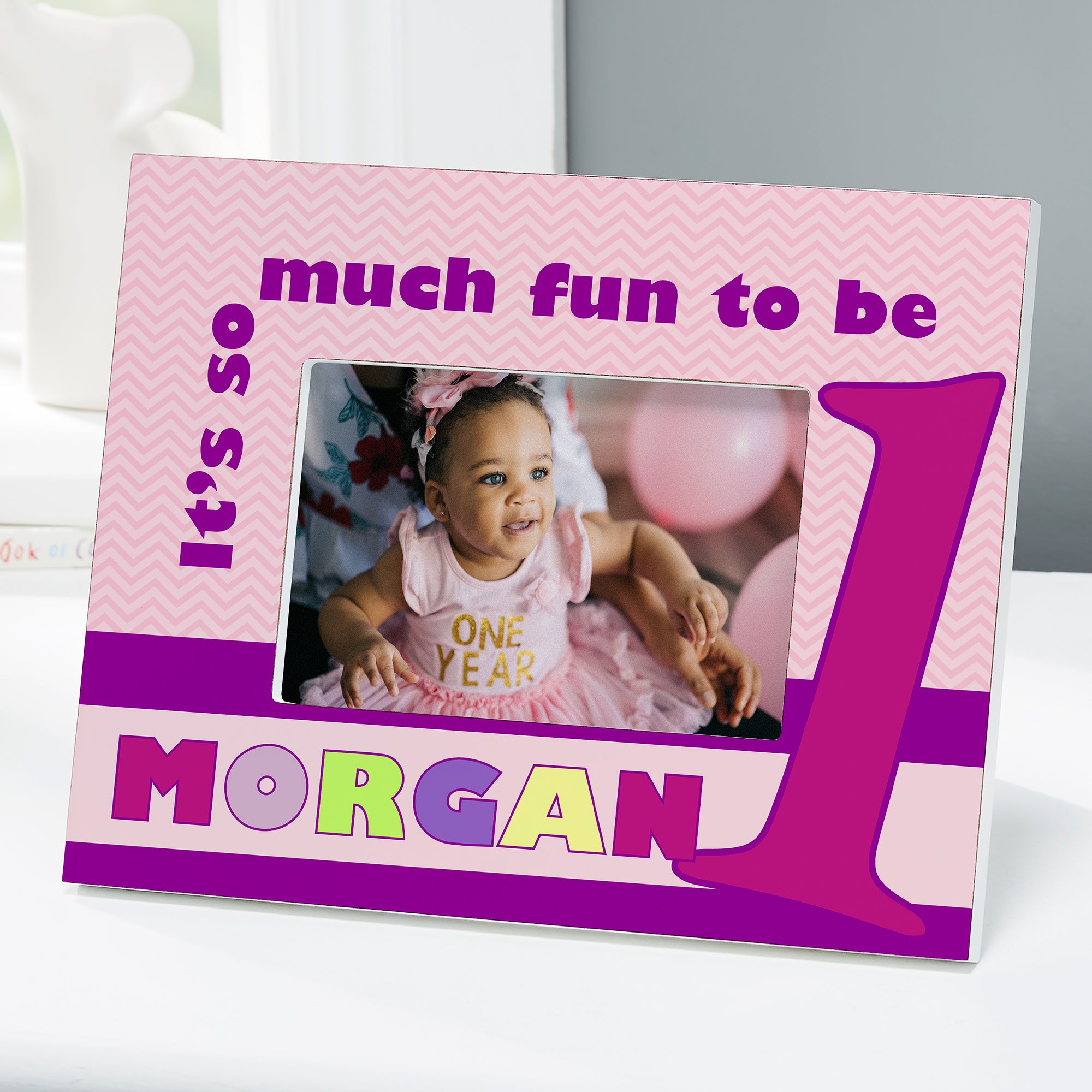 Capture your little one's picture perfect moment forever, in our First Birthday Personalized Picture Frame, for memories that last a lifetime! Bright and colorful graphics surround a favorite photo of the birthday boy or girl to fit their new age perfectly!