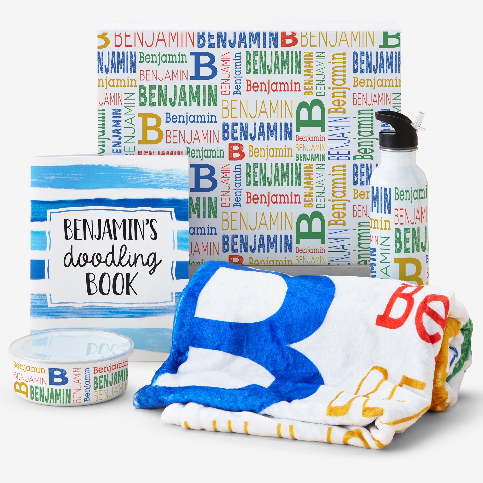 Wrap them in warmth and creativity with our Trendy Repeating Name Personalized Boys Gift Set! This delightful collection is made up of a cozy blanket, water bottle, enamel bowl, and a doodling book making it an ideal gift for birthdays, holidays, or just to brighten their day.