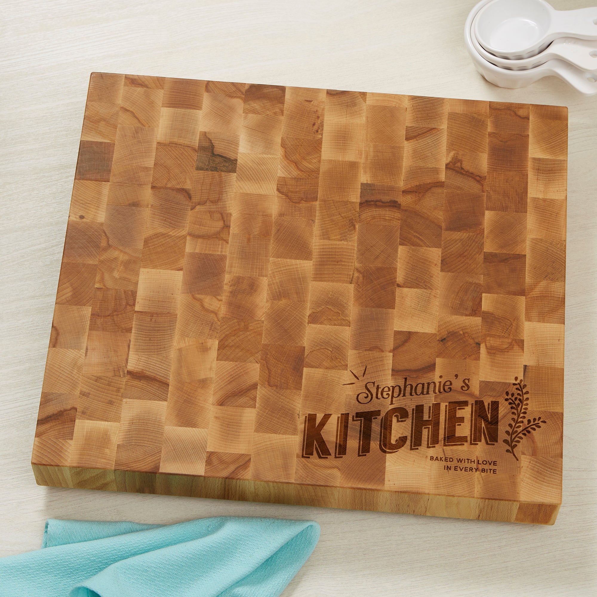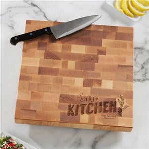 Our Her Kitchen Personalized Butcher Block Cutting Board is a top quality gourmet product made for the serious cook.