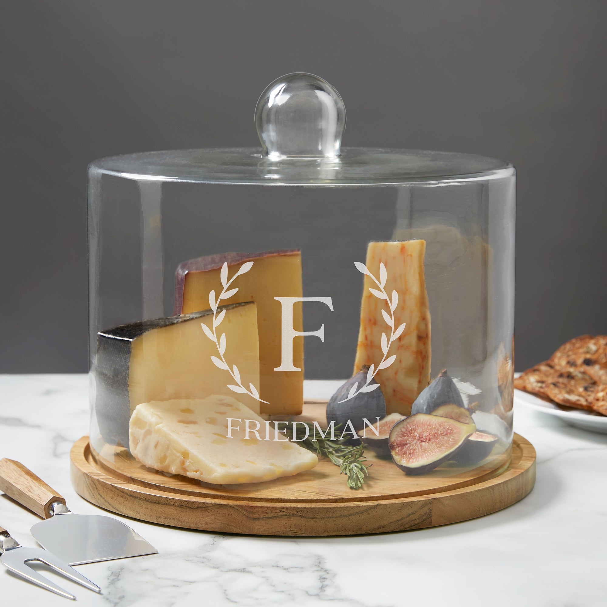 The Laurel Initial Personalized Cake Dome with Acacia Wood Base is perfect for serving and displaying dessert and cheese or even using as décor.