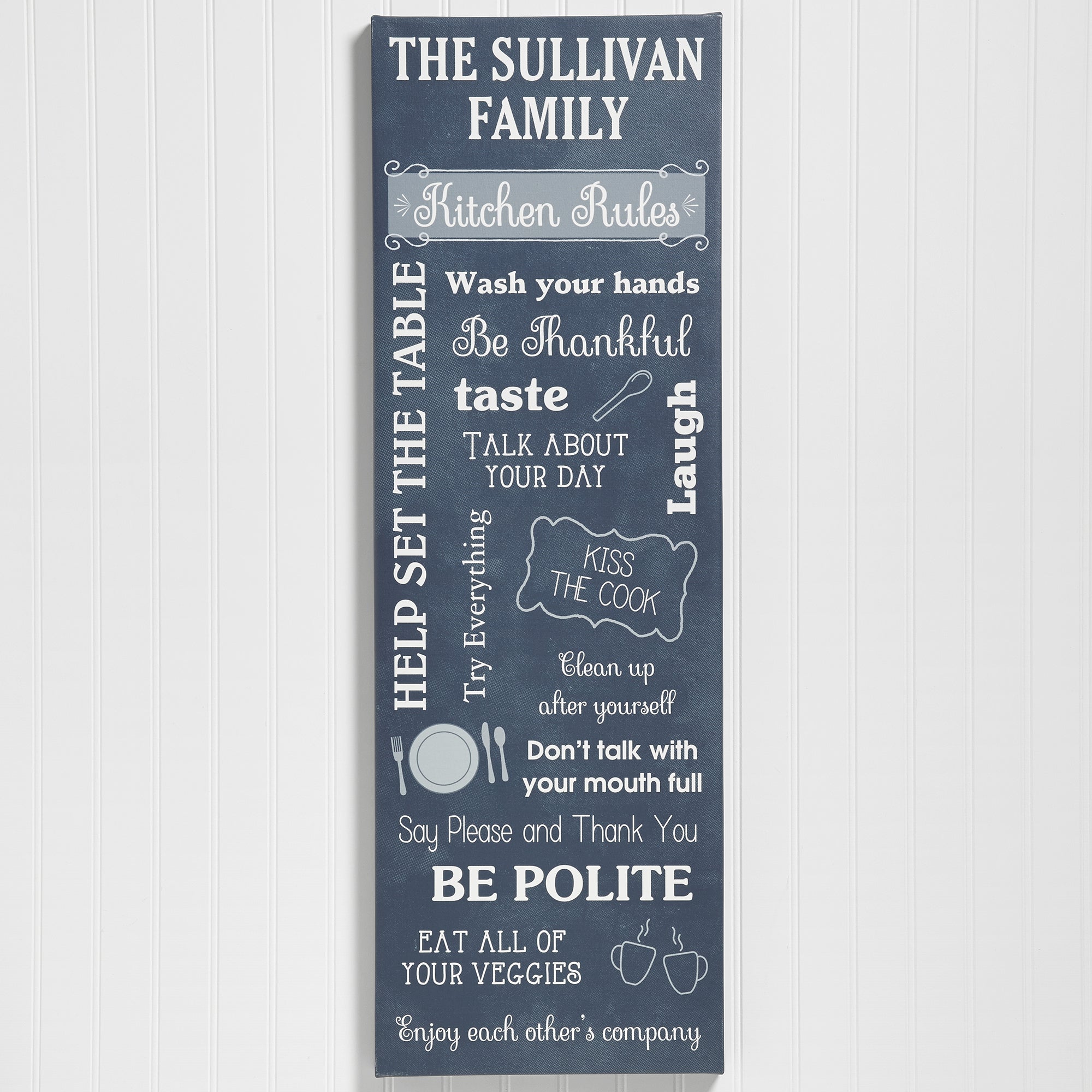 Your kitchen, your rules. Remind everyone to mind their manners with our Kitchen Rules Personalized Canvas Print.