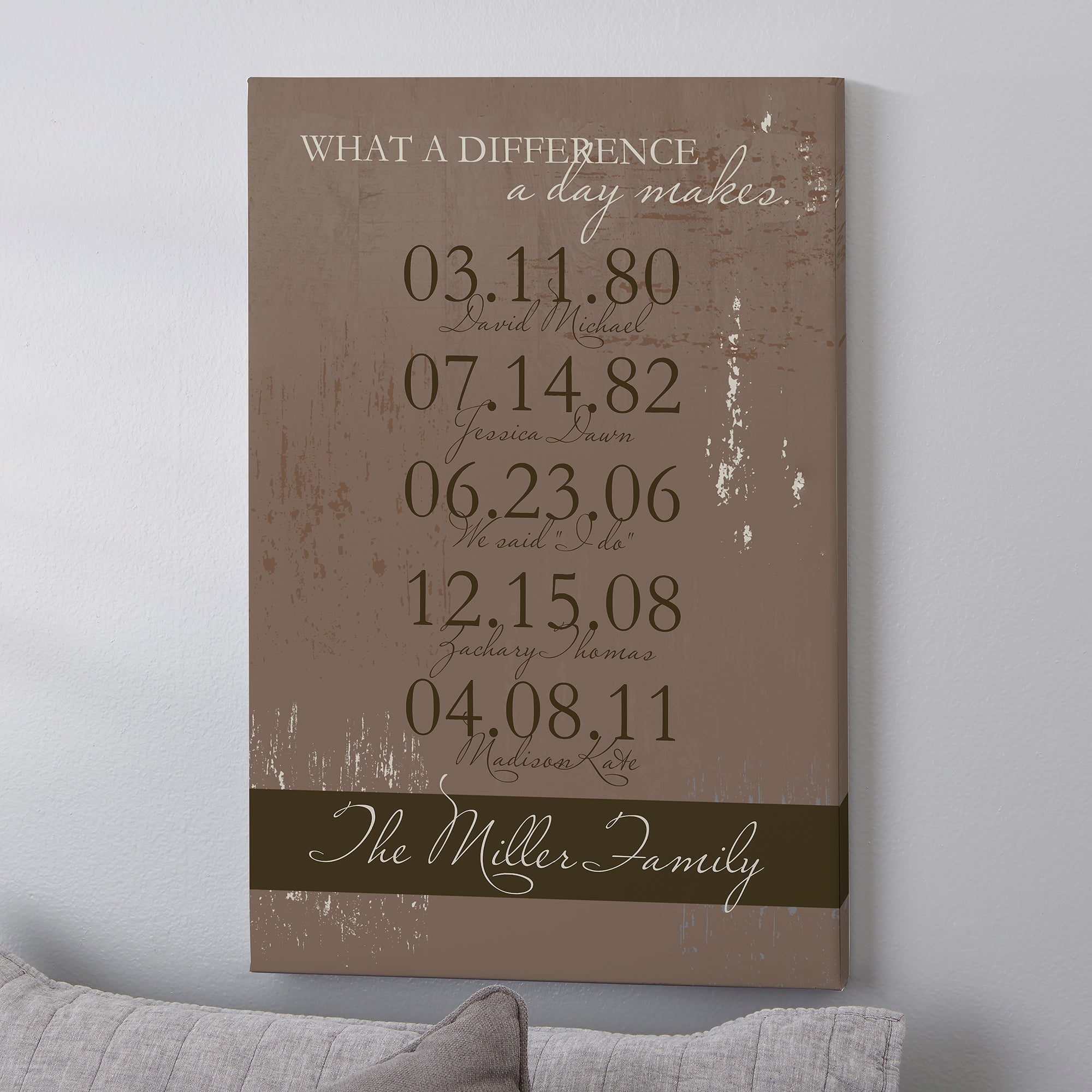 Choose from 2 distressed color options and personalize the canvas print with the couple's names or family name. Enter up to 5 memorable dates and add an optional caption under each date that highlights all of their favorite memories like their wedding date, kids' birthdates, new home, etc.