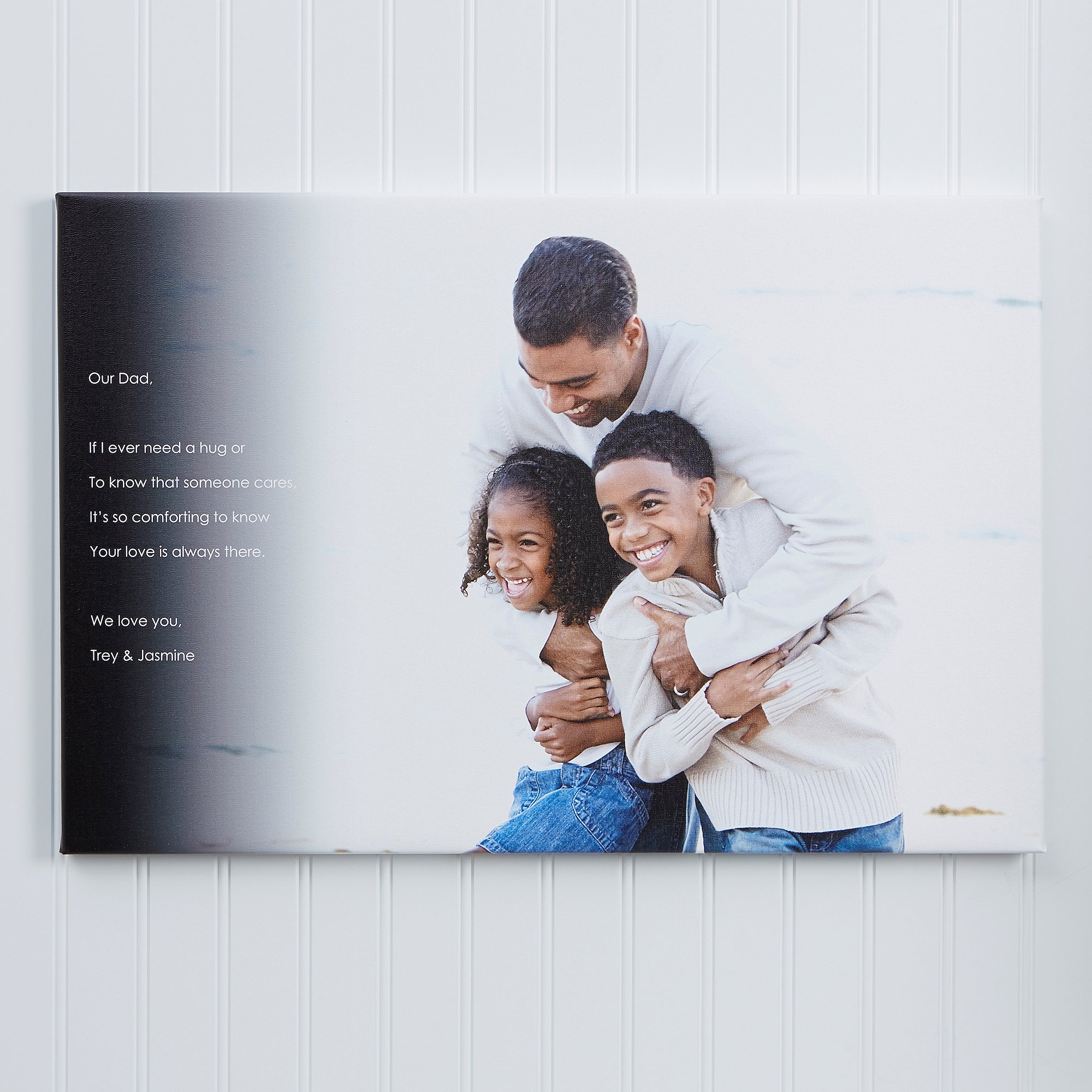 Include one of our 11 verses suitable for dad, grandpa, uncle, and more, or choose to write your own precious sentiment. Choose left or right text alignment of your text and we apply a dark transparency on the same side as the text across the photo to enhance your personalization. Choose vertical or horizontal orientation.