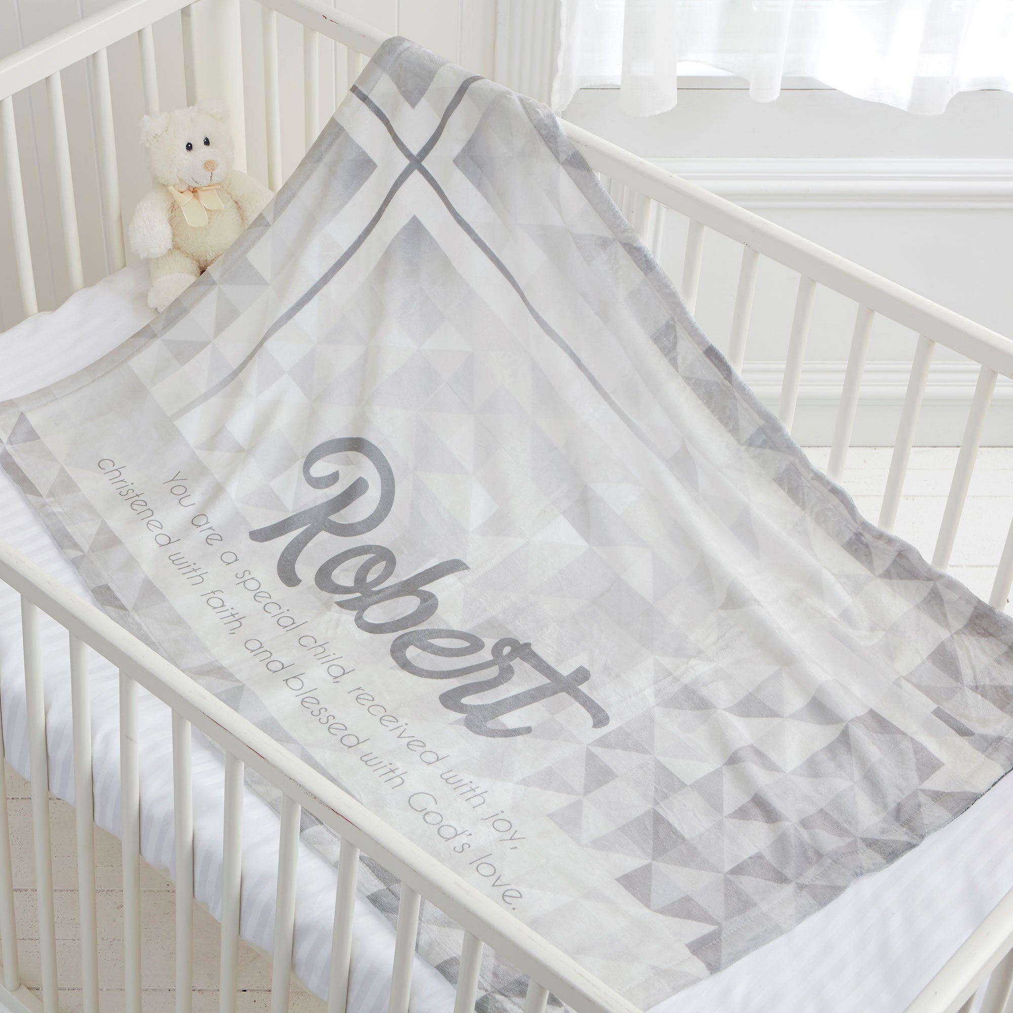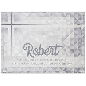 Each blanket will feature baby's name and a touching verse set against a delicate, diamond-inspired background and accented by a cross in the upper left corner. Choose from 3 color options!