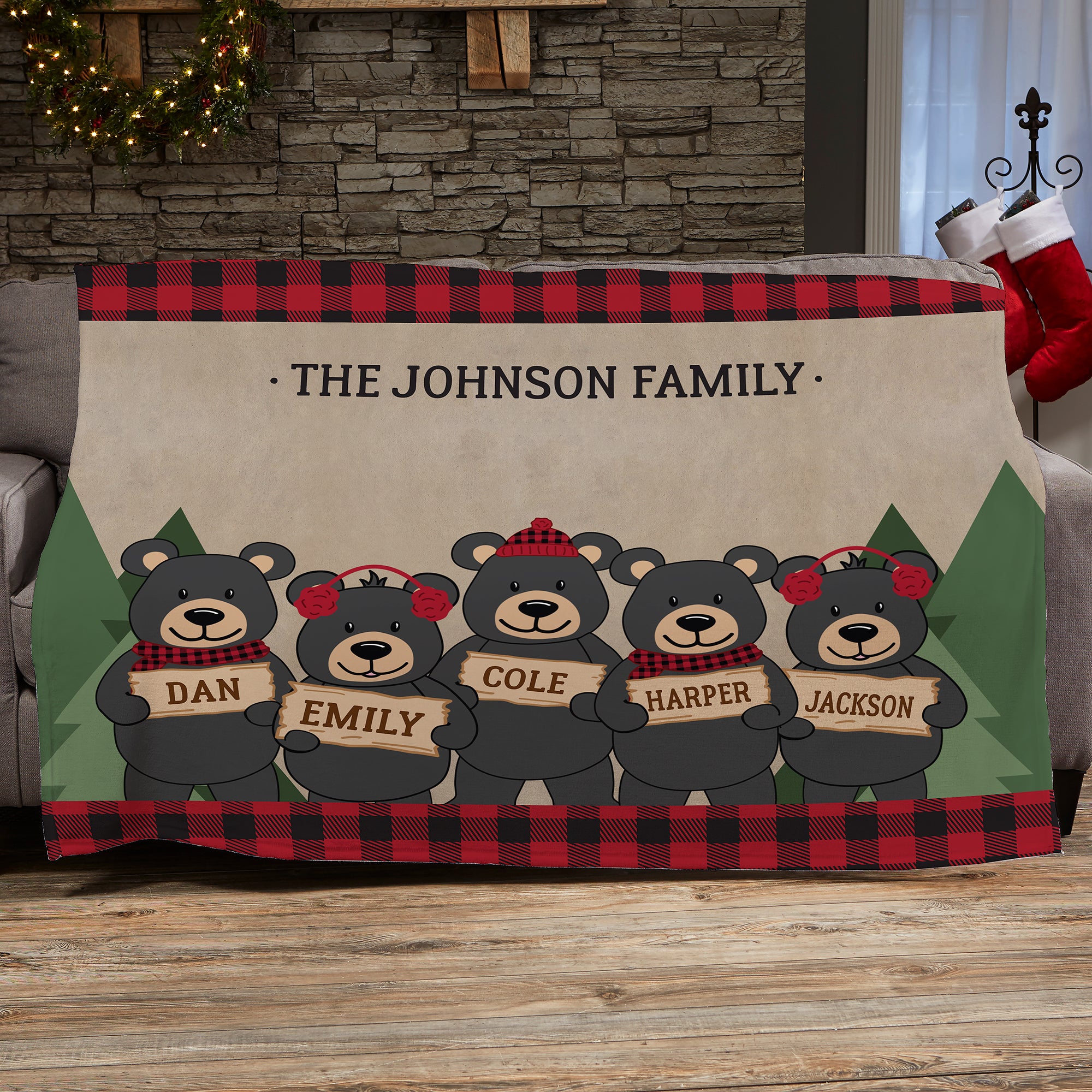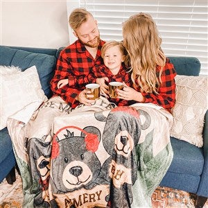 Add some holiday flair to your chair or sofa with our Holiday Bear Family Personalized Blanket. The woodsy scene displays adorable black bear characters, making this a blanket you can use all winter.