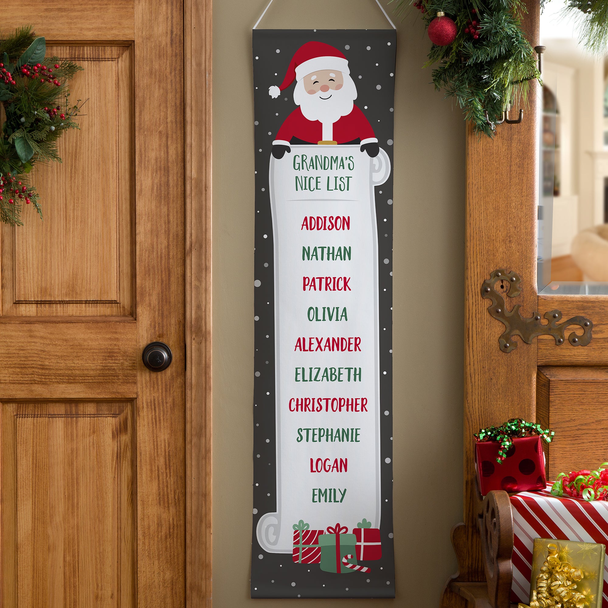 Let everyone know who has been "nice" this year, with the Santa's Nice List Personalized Christmas Door Banner. A great accent piece to hang on your front door (indoors only), in an entry way or a hallway.