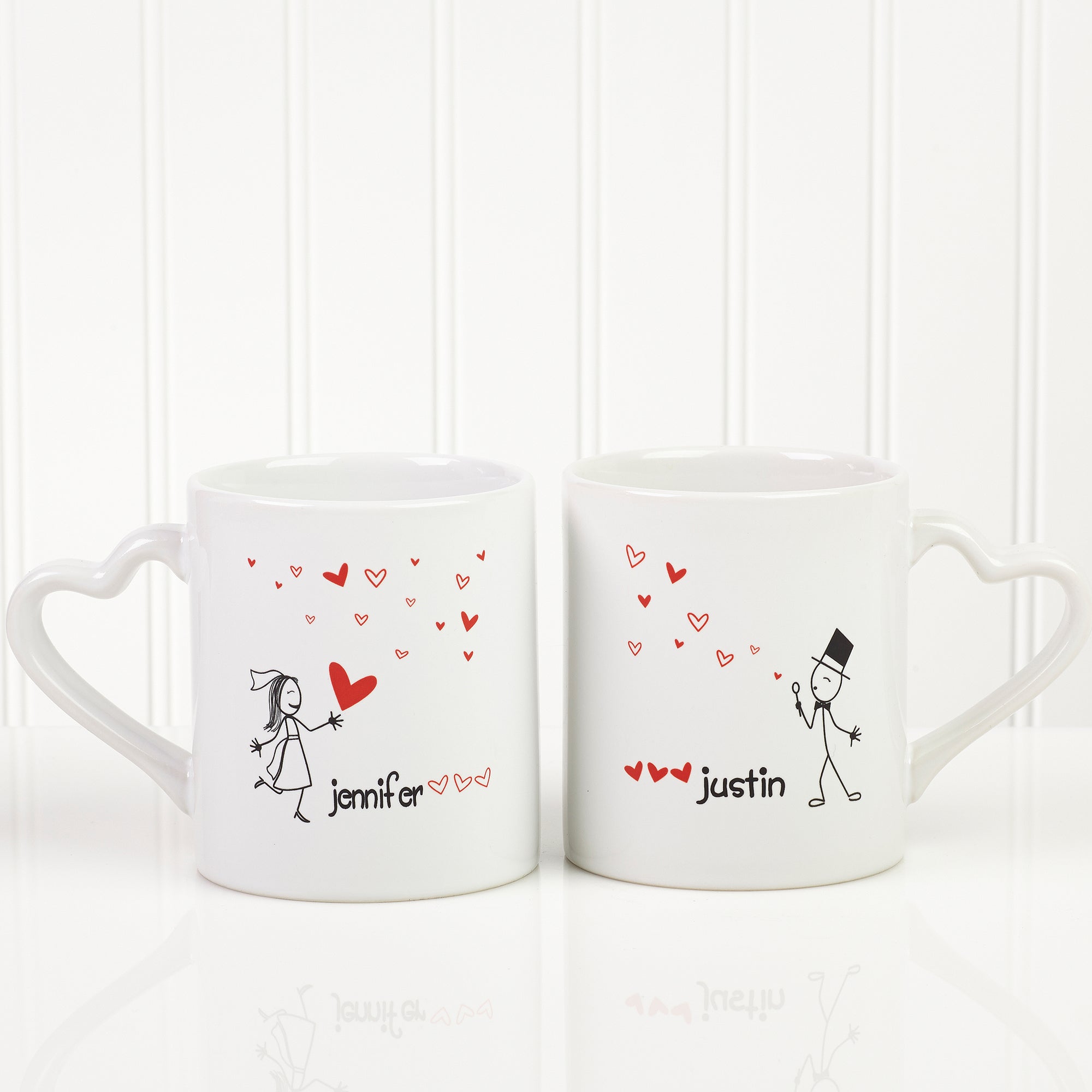 This personalized Coffee Mug Set is the perfect pair for any perfect pair you may know. Our exclusive design features our cute stick figure bride and groom blowing heartfelt kisses to one another across each mug.