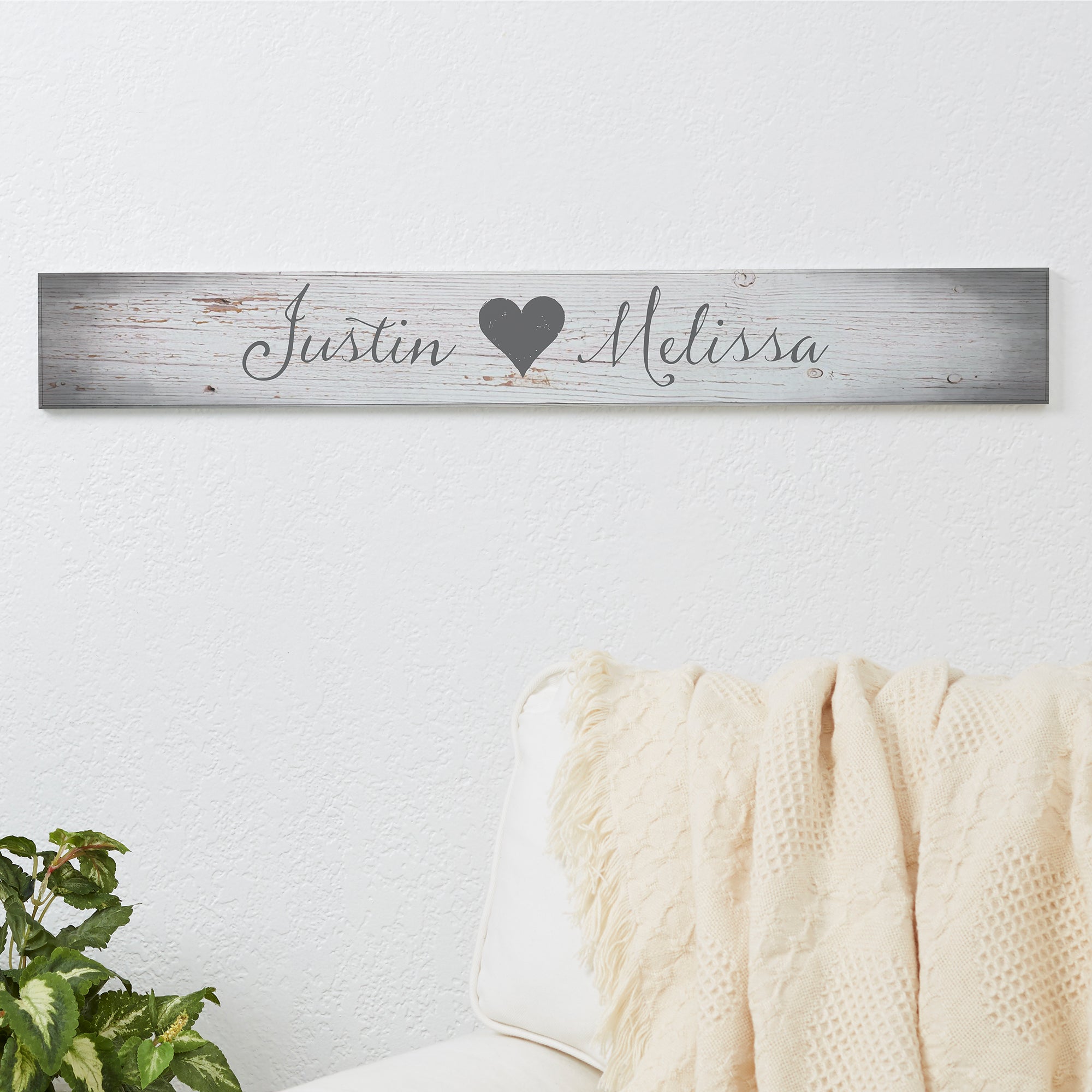 The printed distressed wooden background is offered in 3 color options and makes the perfect backdrop to any 2 names. This simple and rustic design will look beautiful hung on a wall or resting on a mantel.