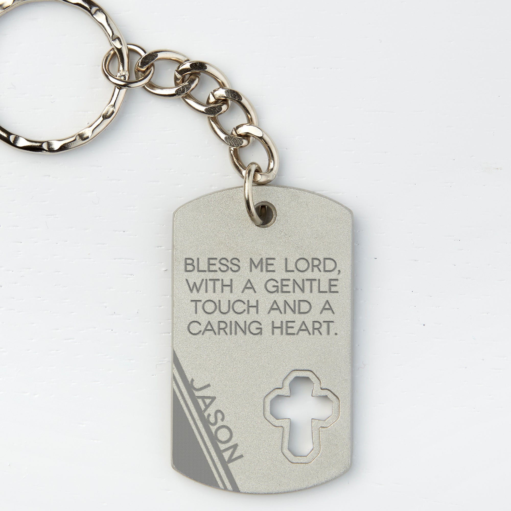 Send your loved one God's blessings and safety while they drive with our Bless This Driver Personalized Cross Keychain.