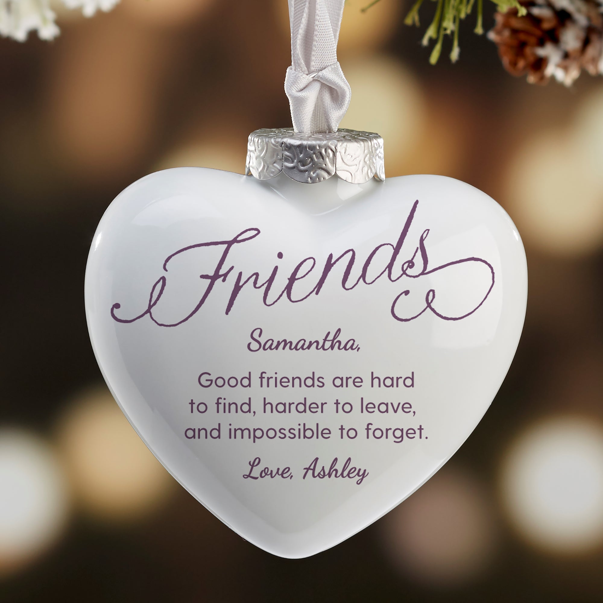 Capture the joy of your Friends-mas with our Friends Forever Personalized Deluxe Heart Ornament displayed on your tree.