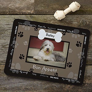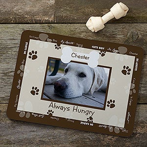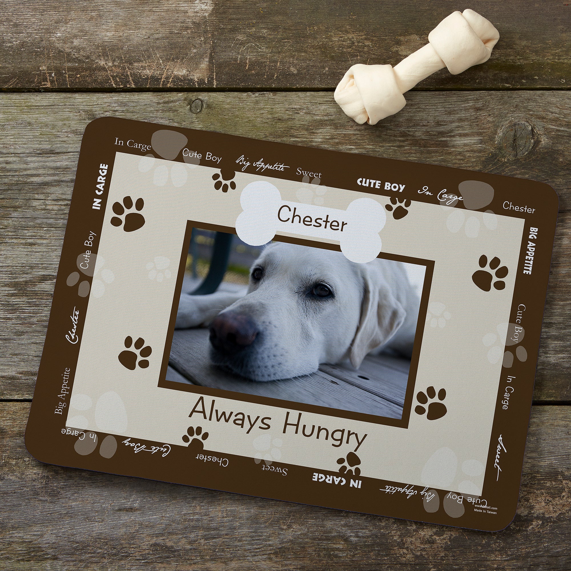 - Personalized with any picture, any name, any title within the bone and any 4-lines of text that will appear around the border of the food mat