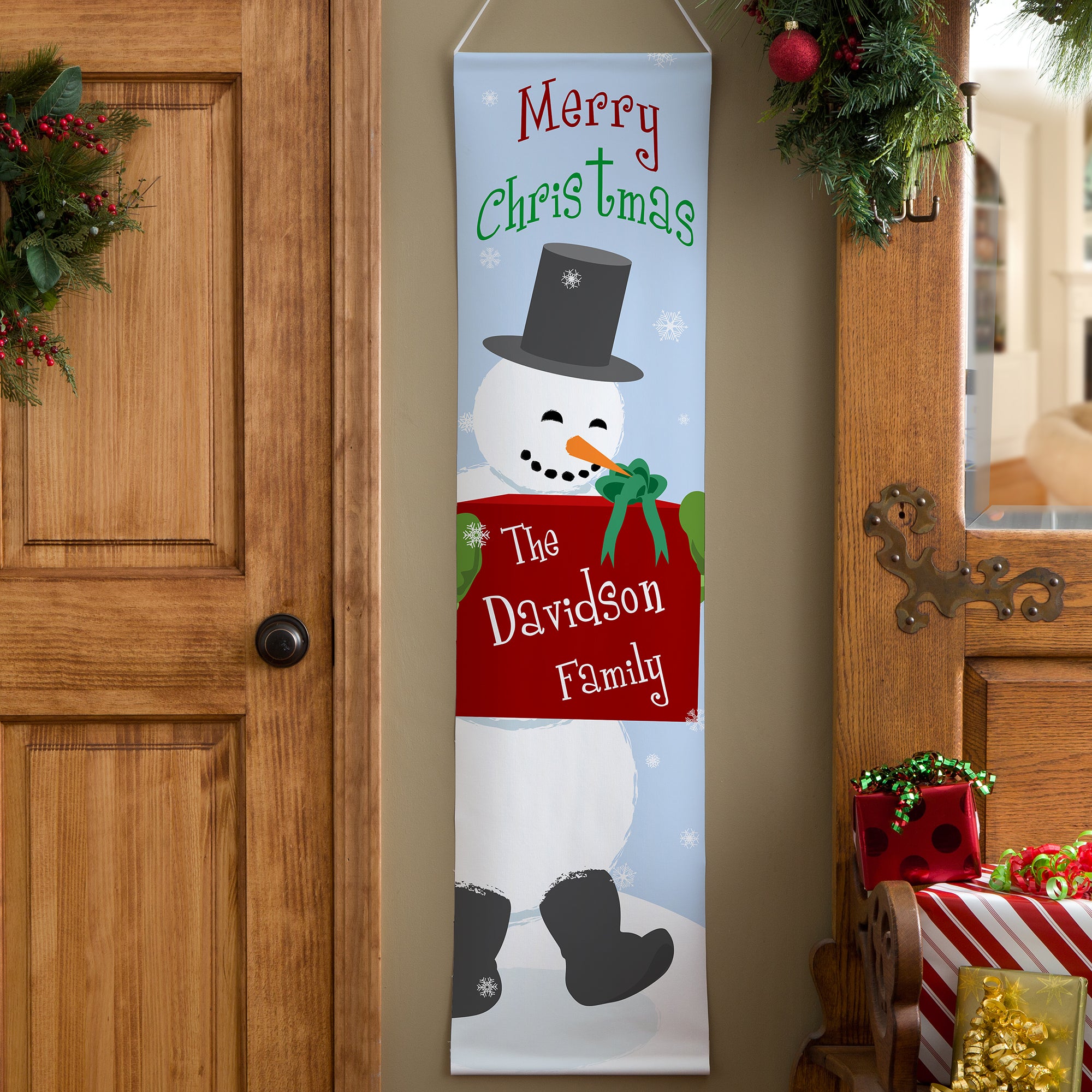Extend Christmas greetings to friends and family with our exclusive Merry Christmas Personalized Door Banner. A great accent piece to hang on your front door (indoors only), in an entry way or a hallway.