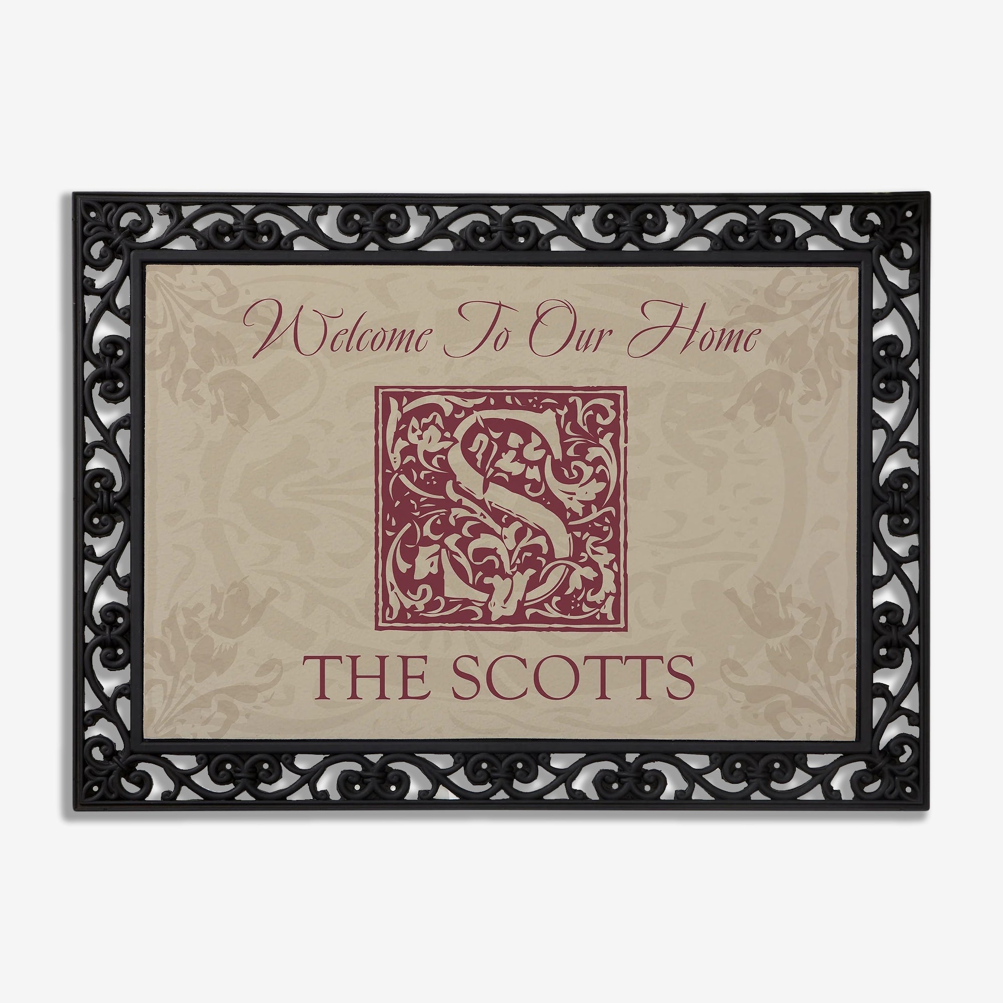 Honor the tradition of family with our exclusive Floral Monogram Personalized Doormat. Our artists have created an elegant floral monogram cast on a scrolling watercolor backdrop in shades of beige and brown. Neutral color options are featured to beautifully accent any home decor.