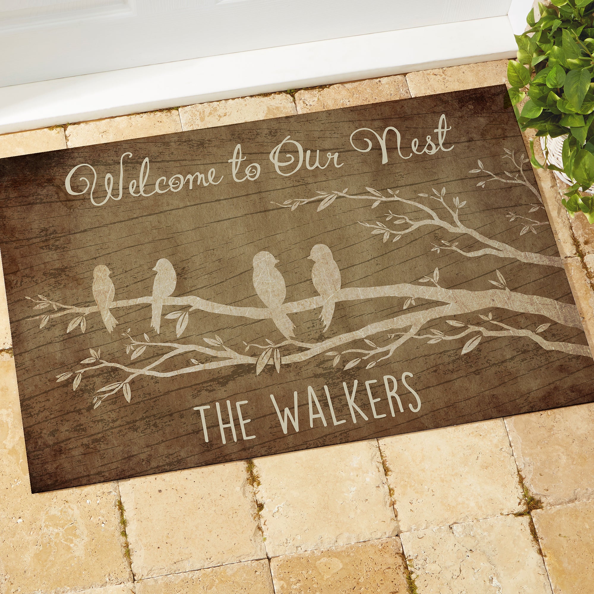 - Personalize the rustic background doormat with 2-7 birds on the branch along with any 2 lines of text