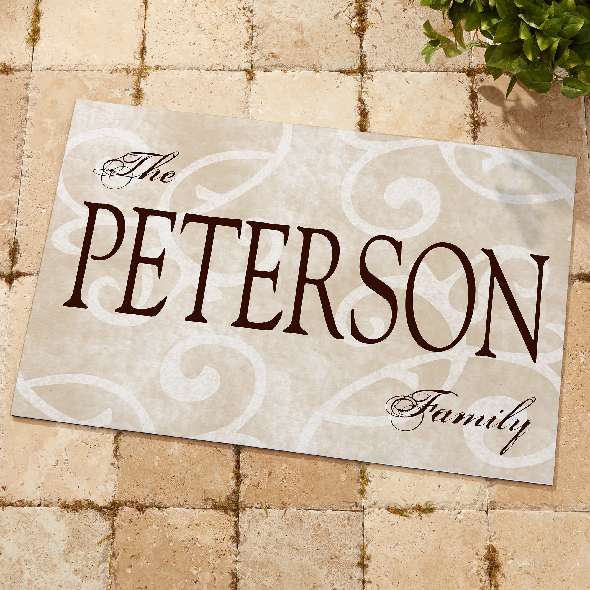 - Personalize with your family's last names printed in rich, brown tone over a neutral, scrolling watercolor backdrop