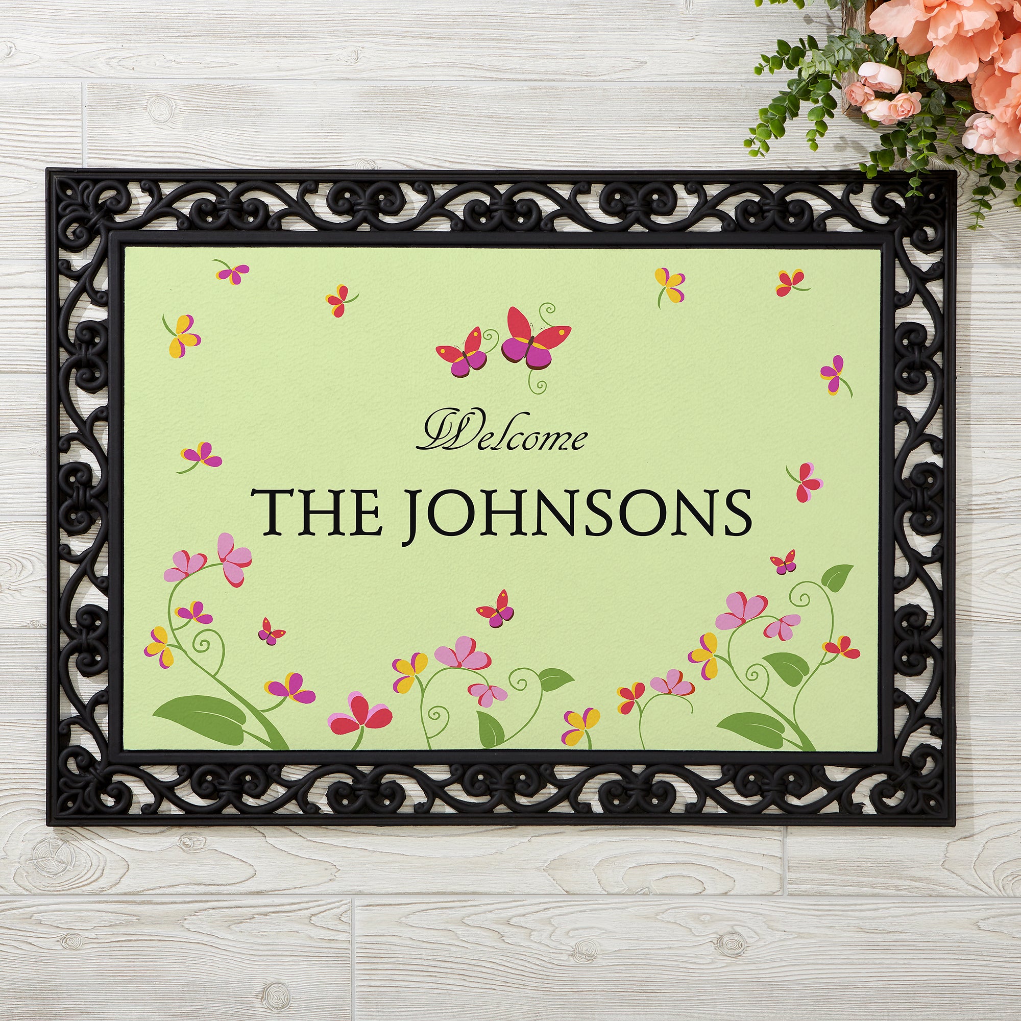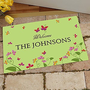 Bring the garden right up to your front door with our Floral Welcome Personalized Doormats. Our exclusive design, featuring an array of springtime flowers accented with bright butterflies, provides a distinctive welcome to your home.