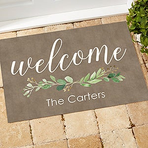 Create a warm welcome all year round with our Greenery Welcome Personalized Doormats. Our taupe doormat is accented with a watercolor greenery laurel and is the perfect accent piece for any home.
