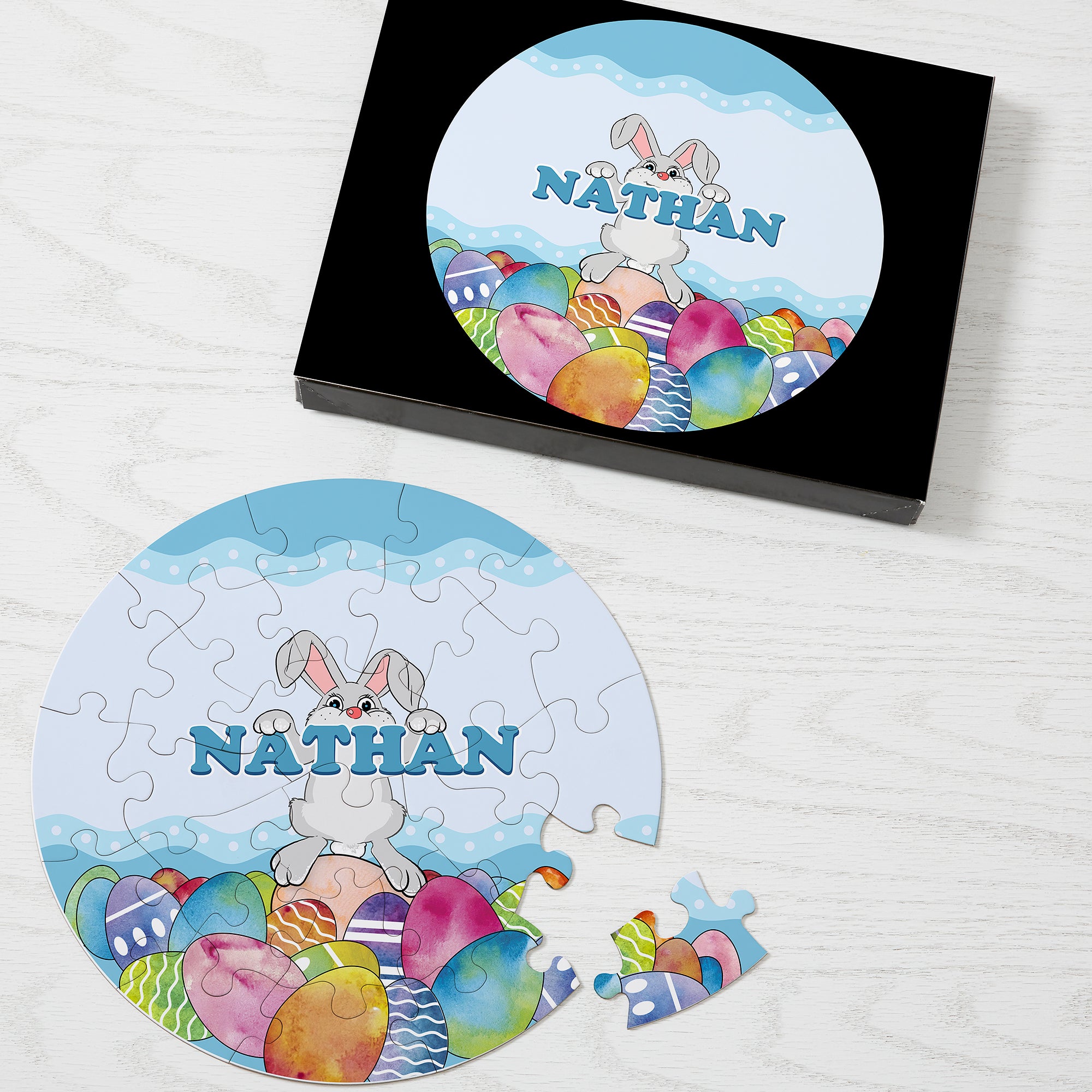 Put their name in the game with our Bunny Love Personalized Easter Puzzle! Our exclusive design comes in your color choice of pink or blue and has a long-eared lovable bunny standing on a pile of colorful eggs.