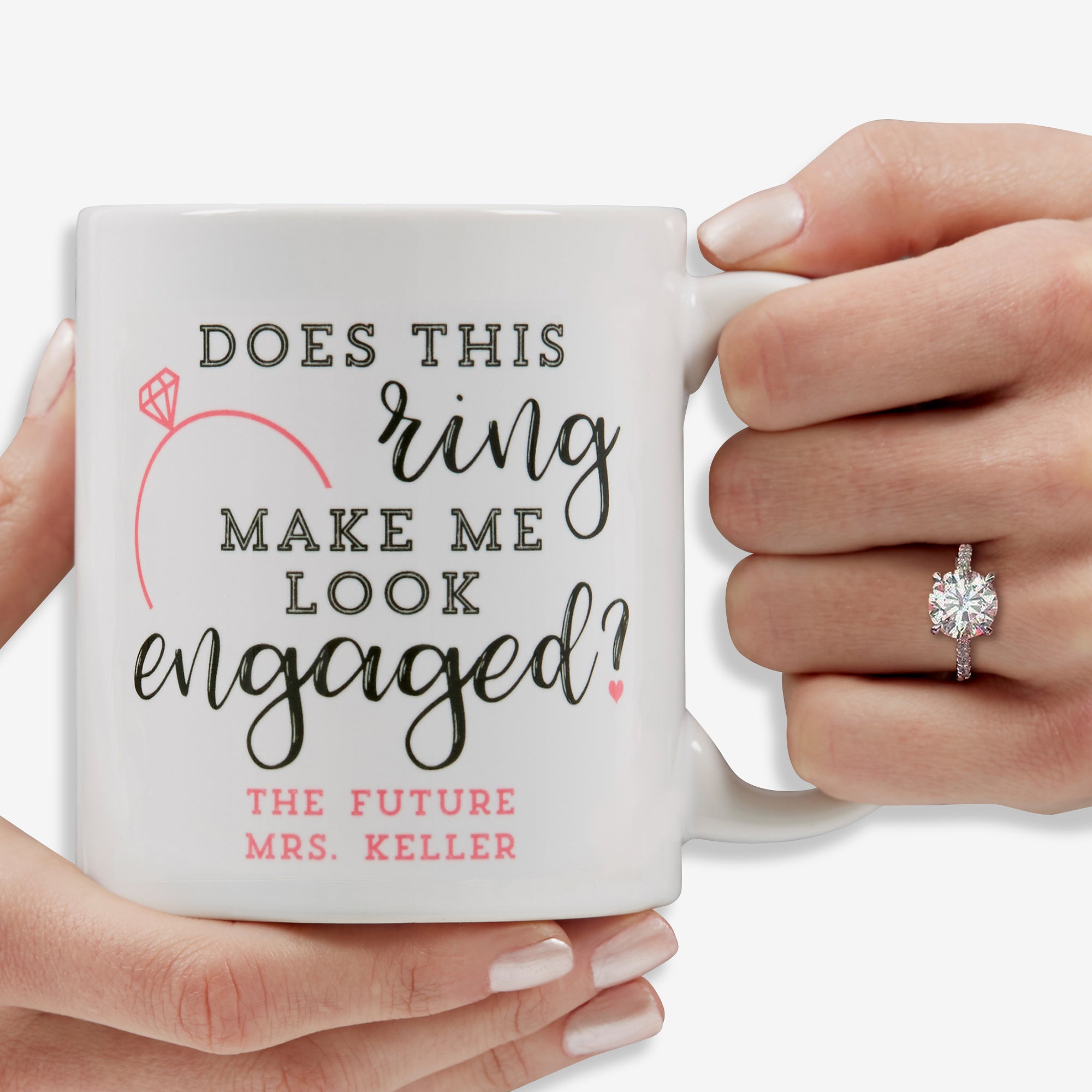 Our exclusive Do I Look Engaged? Personalized Coffee Mugs makes the perfect gift to help her show off her new bling!