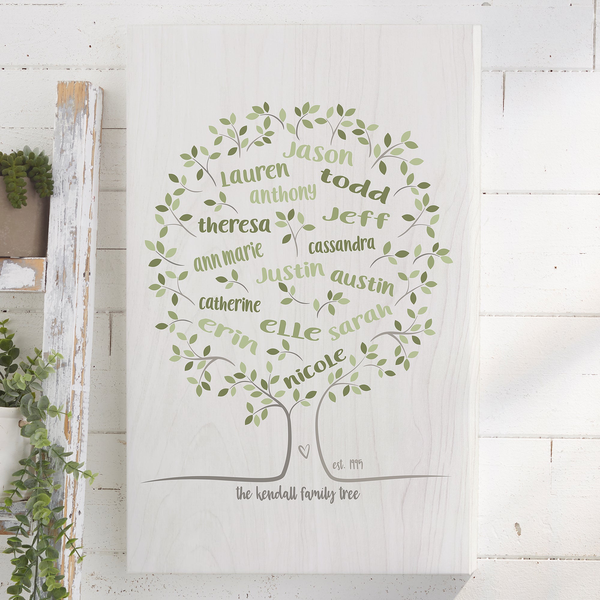 The Family Tree of Life Personalized Canvas Print displays the names of your family members in a beautiful piece of family tree wall art. The green hues of the tree are printed on a whitewashed background and can display your family or multiple generations of names.