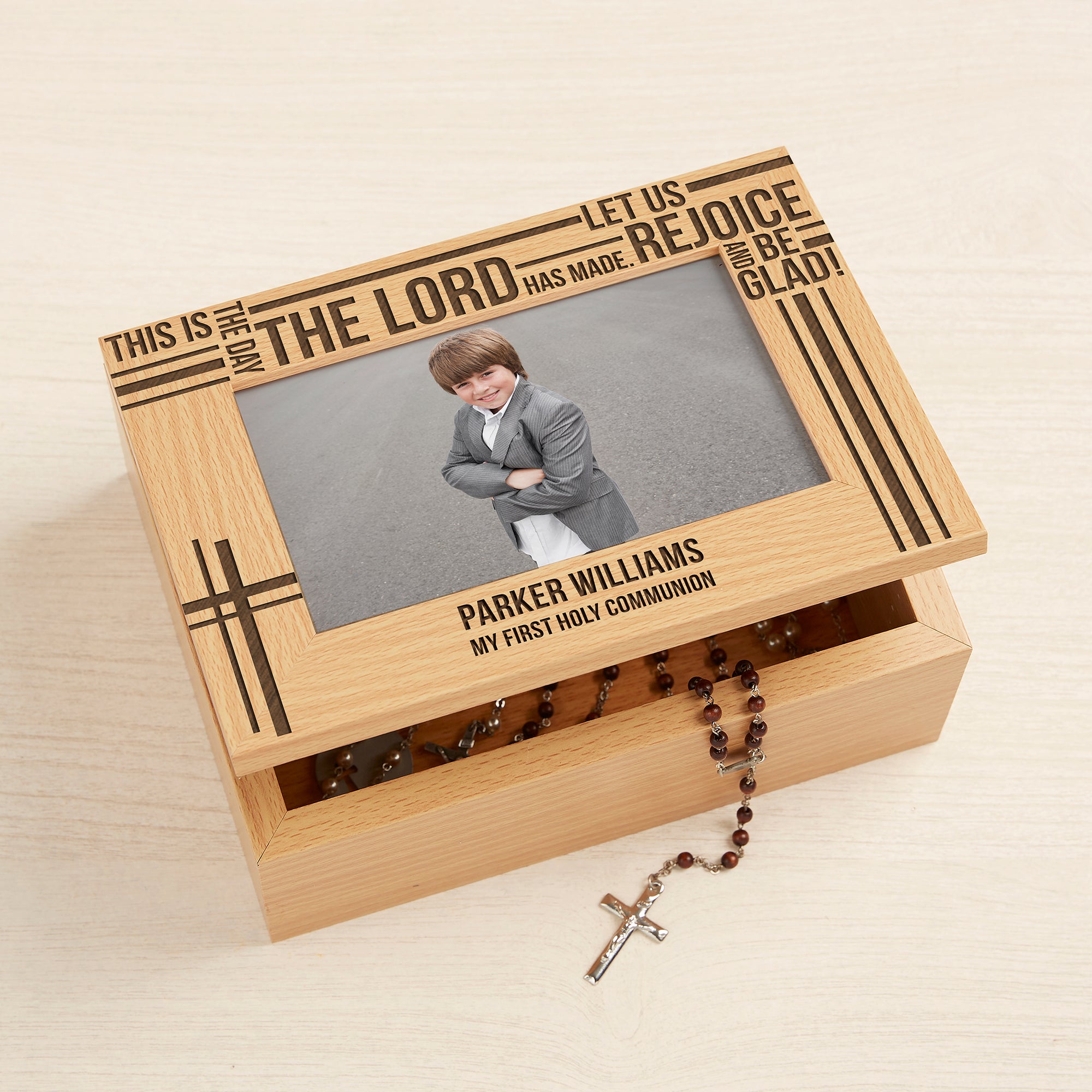 We custom personalize this photo keepsake box by delicately laser engraving their name and any 1-line personalization.