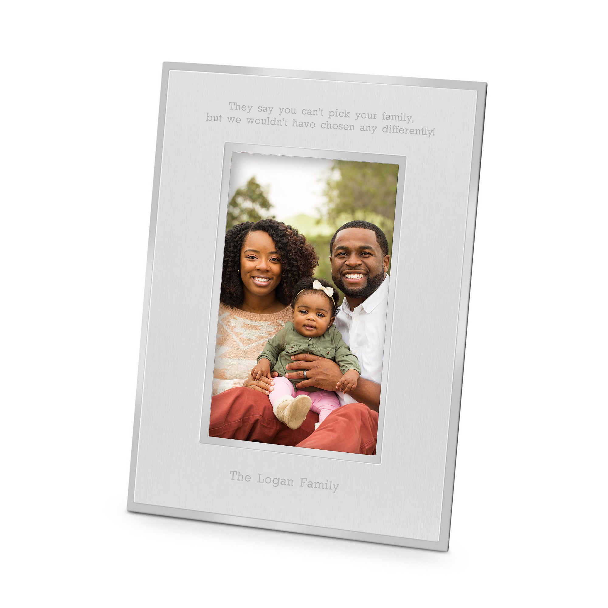 Our Flat-Iron Picture Frame Collection is a fan-favorite, and this silver 4x6 version is no exception! The metal frame features a brushed finish metal with a contrasting high-shine metal boarder, which gives it contrast in texture that has an architectural look. This frame can display their favorite wedding, family, or children's photo with pride and a personal message above or below the photograph.