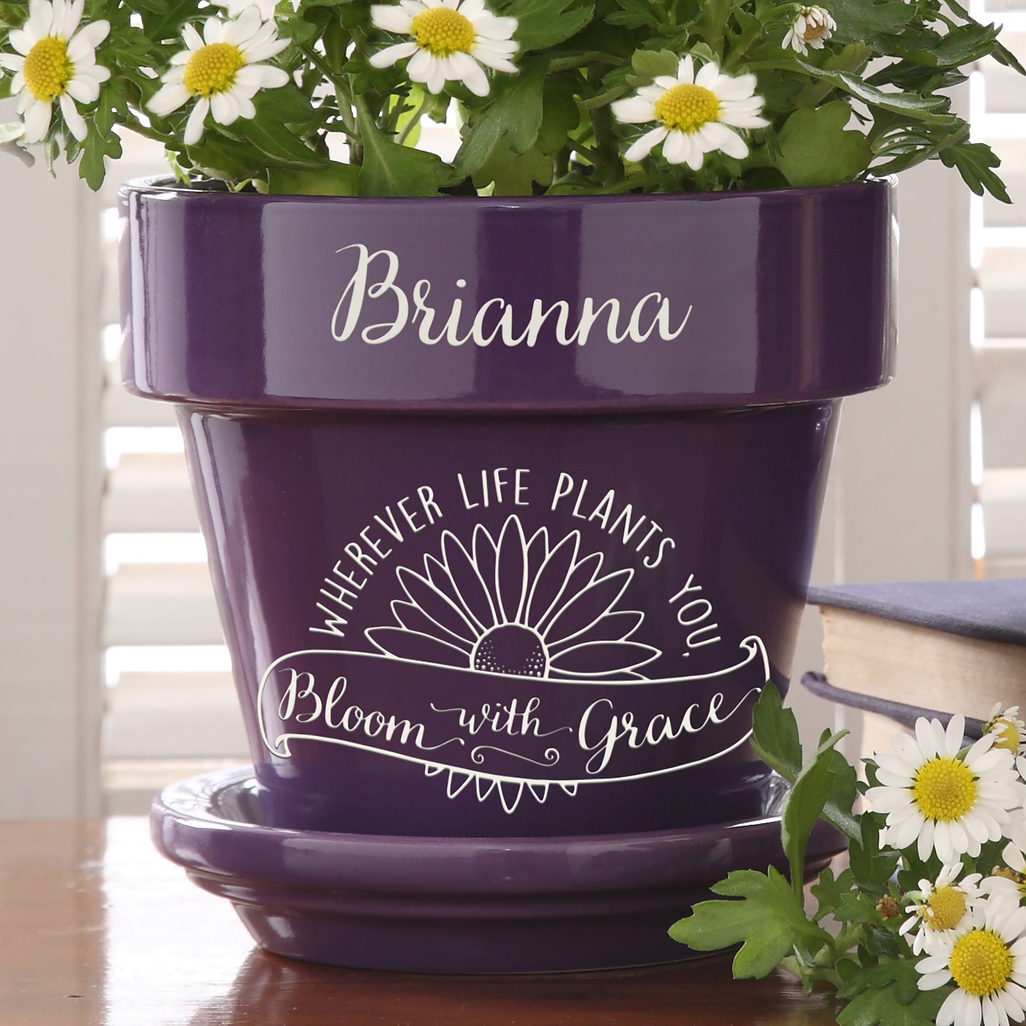 Wherever life plants you, bloom with grace with our Inspiration to Grow Personalized Flower Pot! add their favorite blooming plant to create the perfect gift for a graduation or a retirement!