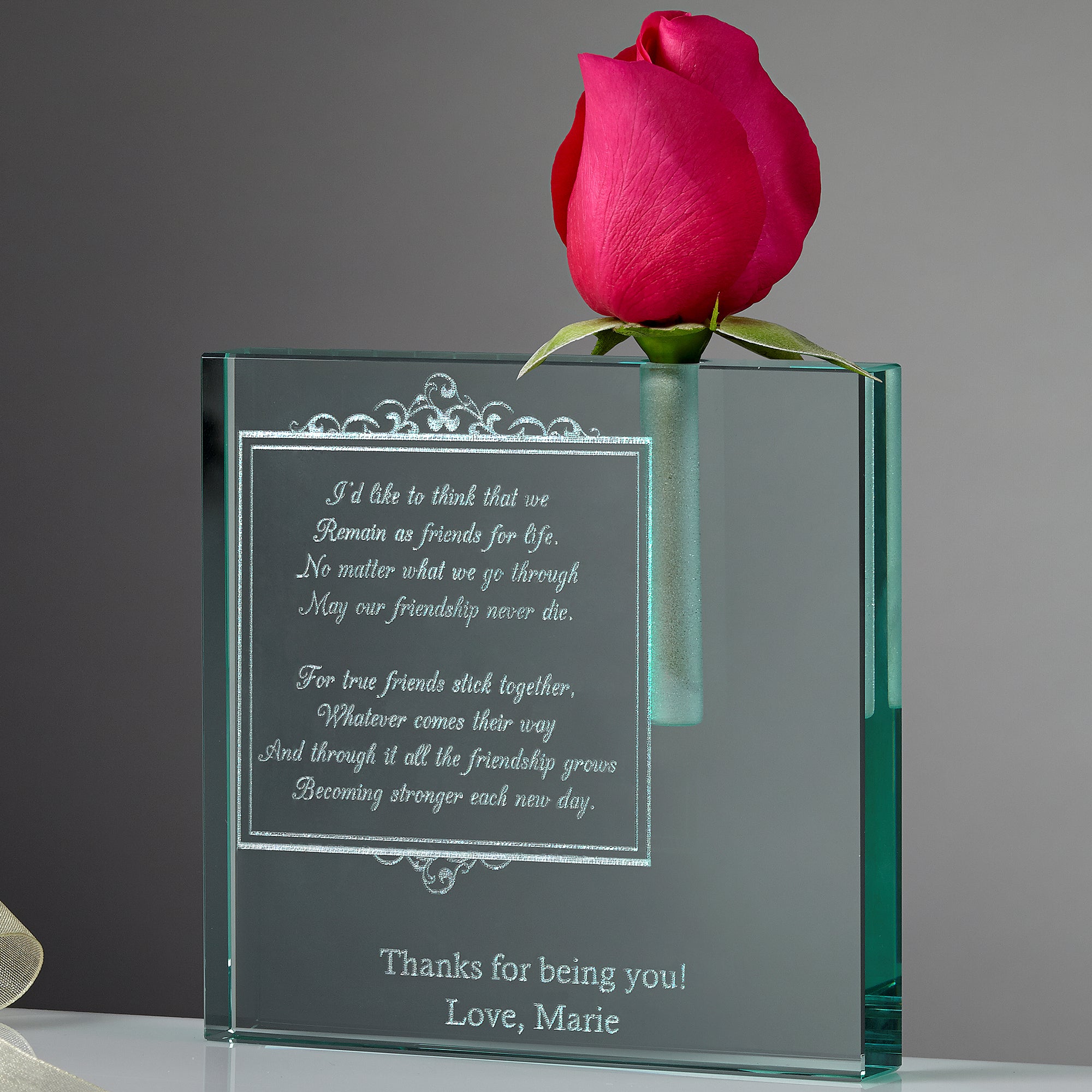 Featuring a contemporary design, this stunning crystal clear glass bud vase is personalized with your choice of 5 touching verses, or write your own for a very personal gift honoring your special friendship.