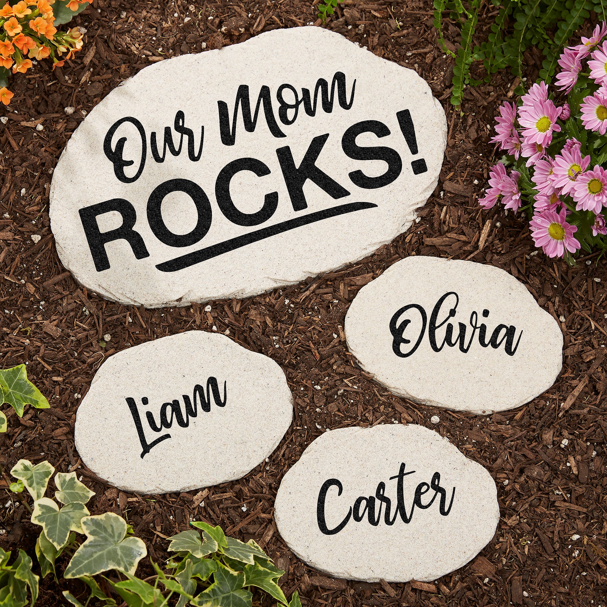 Let her know how awesome she is with our exclusive Our Mom Rocks Personalized Round Garden Stones!