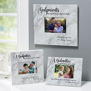 Personalized just for the godmother, godfather or godparents, our exclusive Godparent Personalized Picture Frame will make a charming gift just for them. Personalization will be set against our faux, marble grey and white design. Perfect for baptisms or dedications.