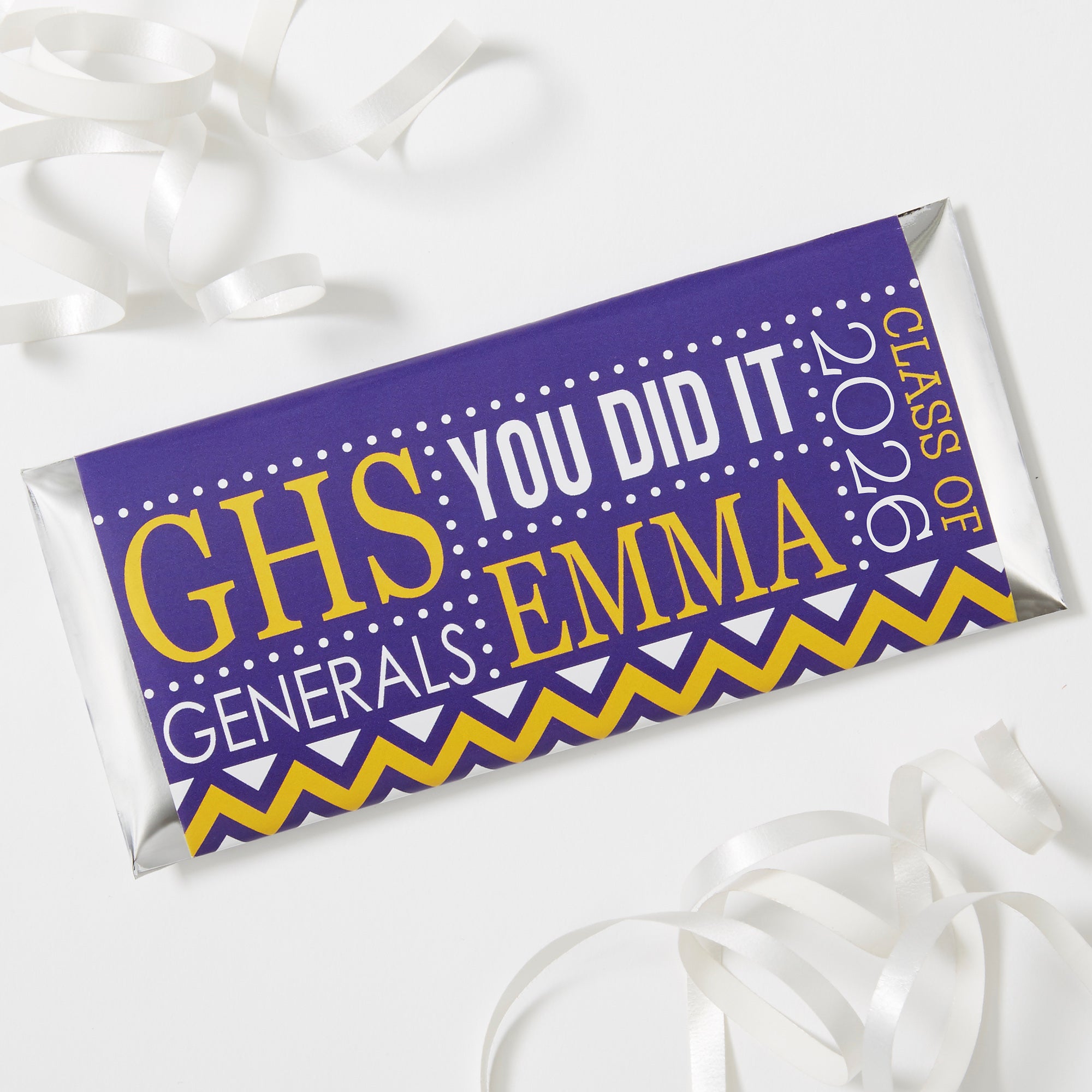 Our School Memories Personalized Candy Bar Wrappers are the perfect favor for any Graduation party! Featuring a fun chevron design, these pair with any standard sized candy bar to create a special favor for your guests.