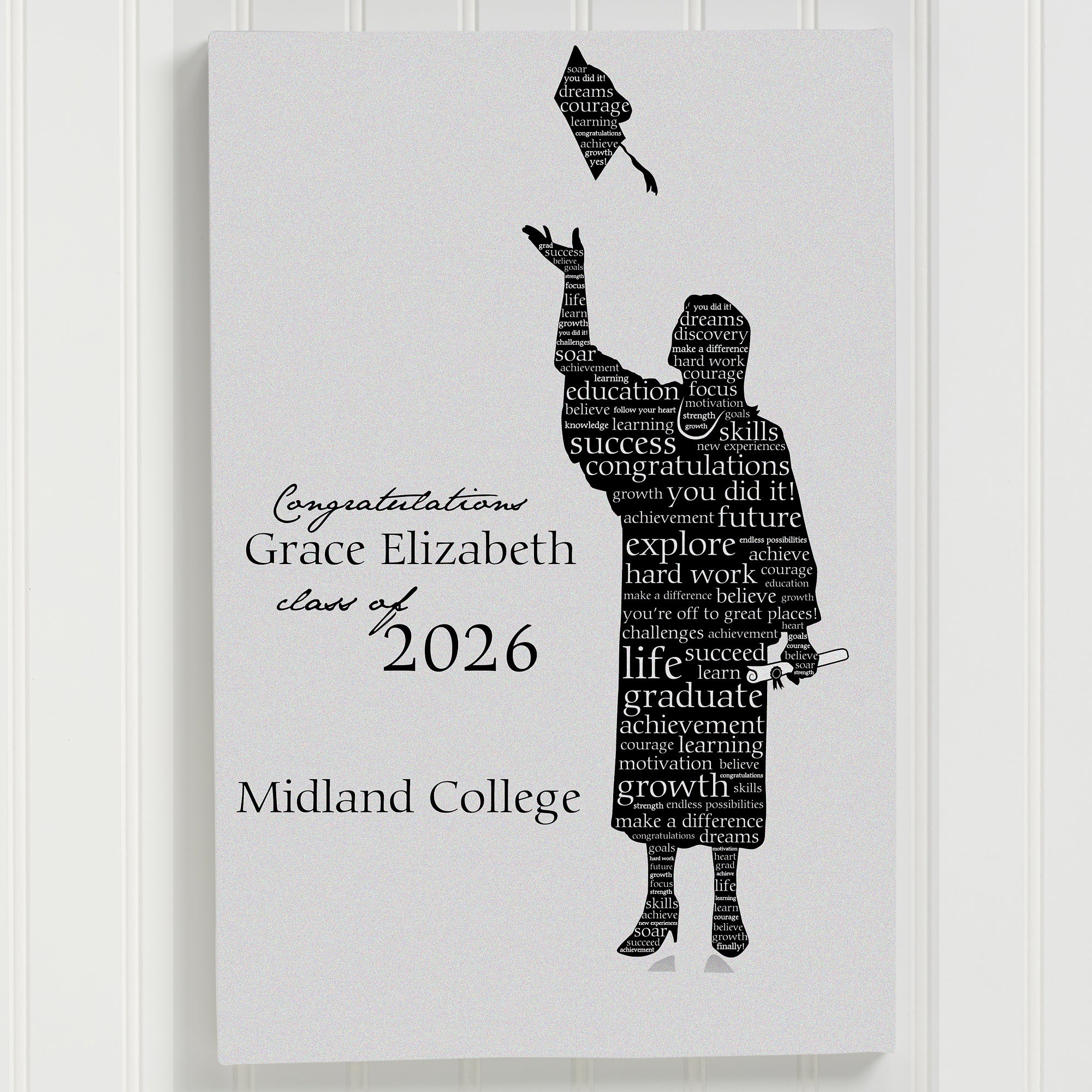 Personalize the canvas by choosing a male or female silhouette, each silhouette is filled with words of encouragement.  Add any 3 lines of personalization and the graduation year. Display the canvas at their graduation party and let guests fill the canvas with well wishes!
