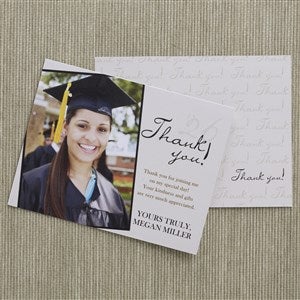 Our Refined Graduate Custom Thank You Cards express your thanks in personalized style! This deluxe thank you card features a colorful, coordinating design on the reverse side of the card! Sure to make your thank you stand out!
