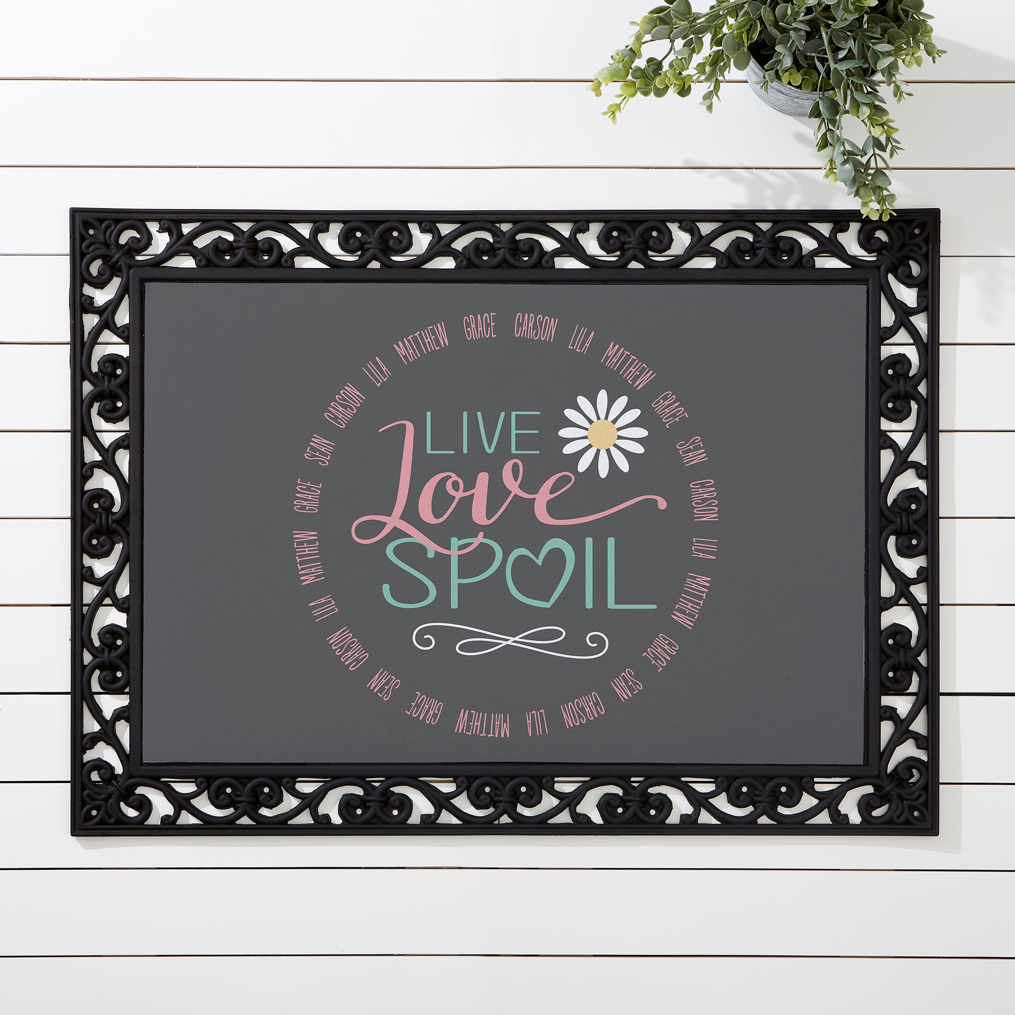 • Personalize with up to 25 names to circle around the Live, Love, Spoil graphic in your choice of 3 color combinations
