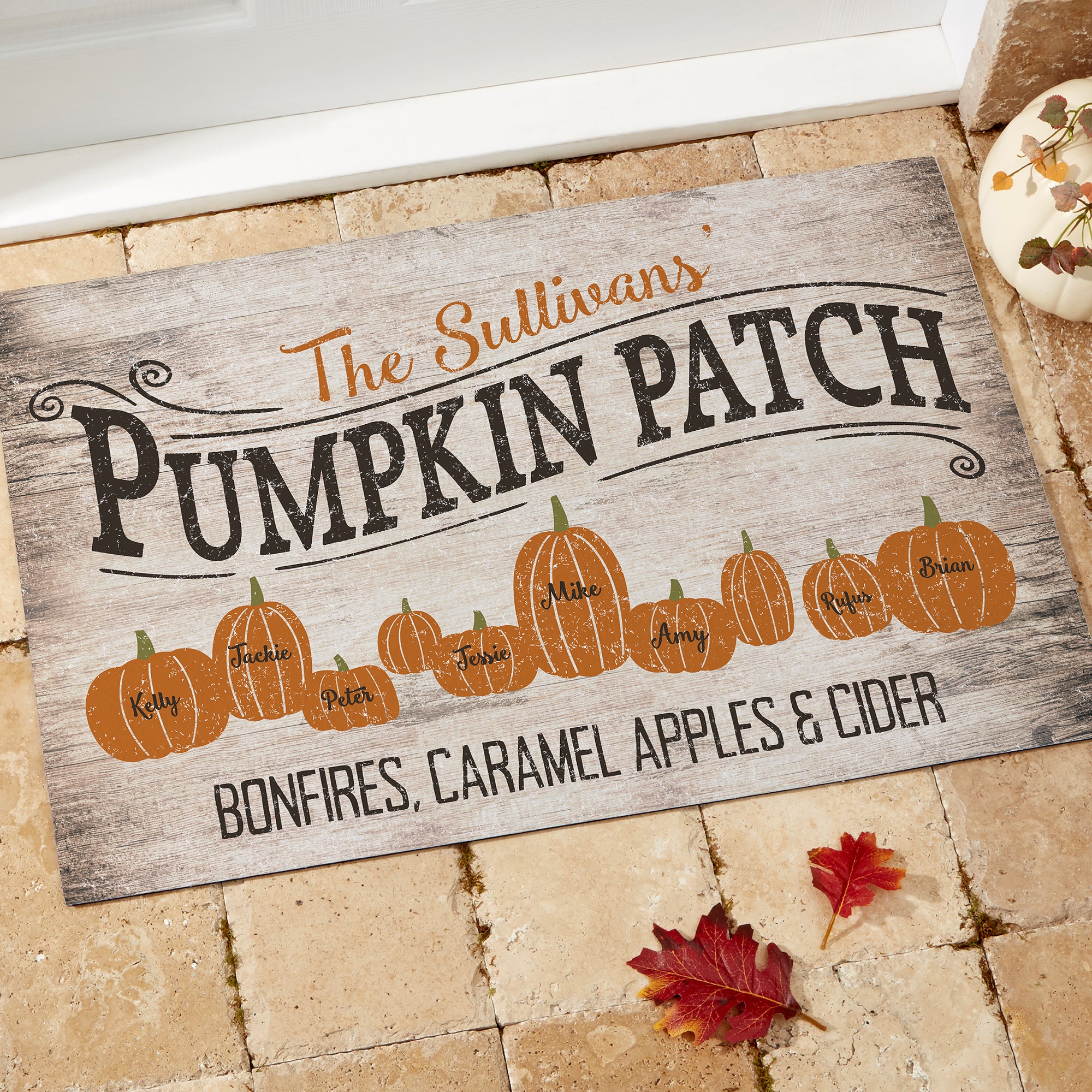 - Personalize with your family name and up to 10 first names printed within the pumpkins along with 1 line of custom text at the bottom