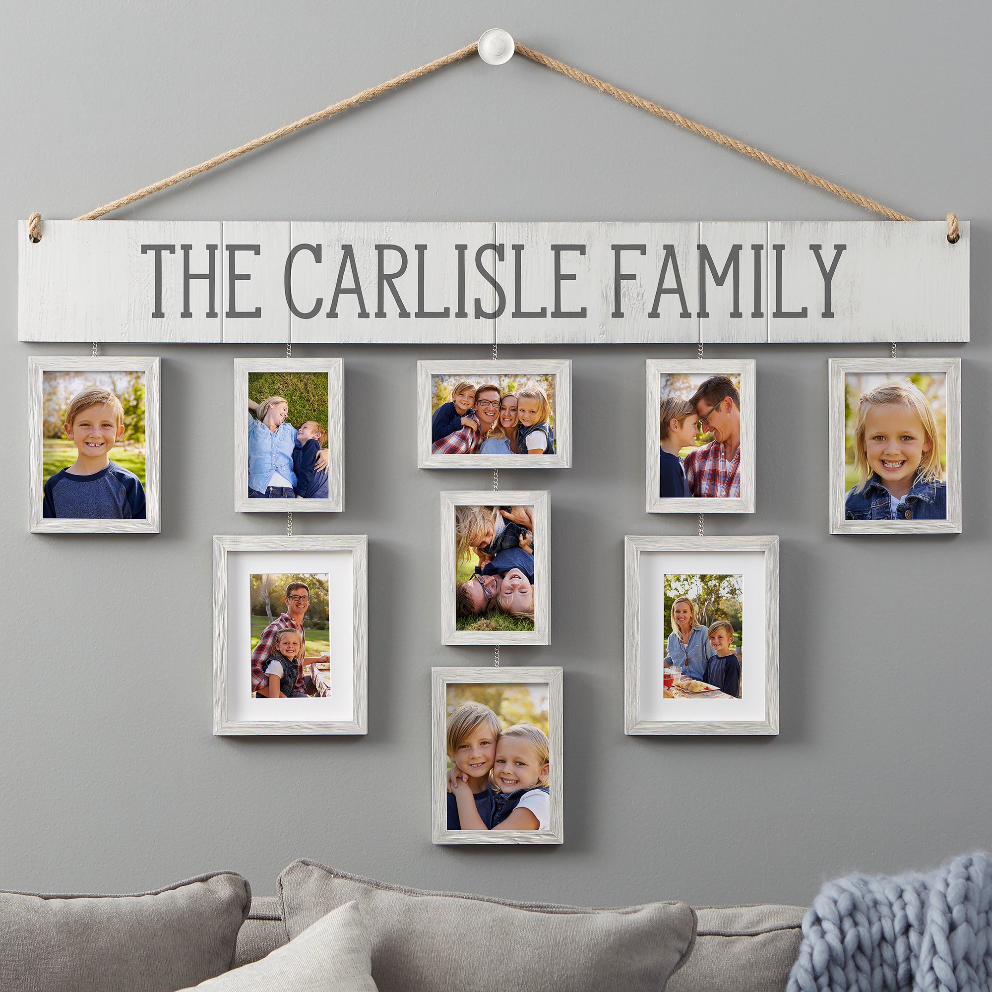 • 10 piece set includes 9 photo frames, personalized top plaque, decorative hanging finial, hanging hardware, and template.