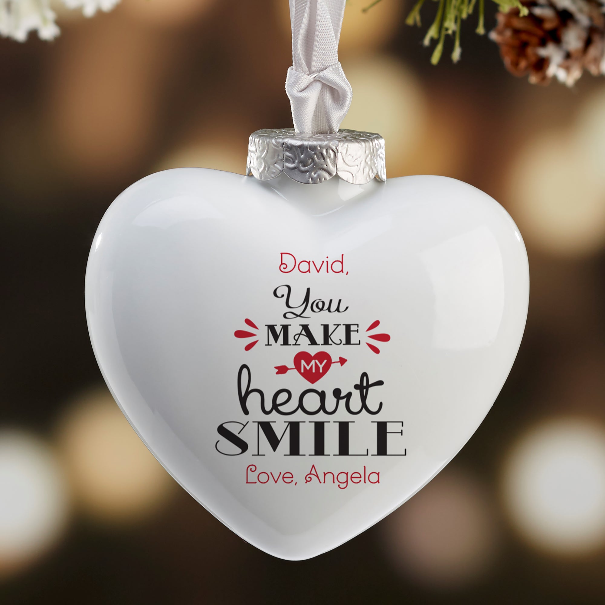 Let him or her know that just a thought of them fills your heart with happiness with our exclusive You Make My Heart Smile Personalized Heart Ornament.