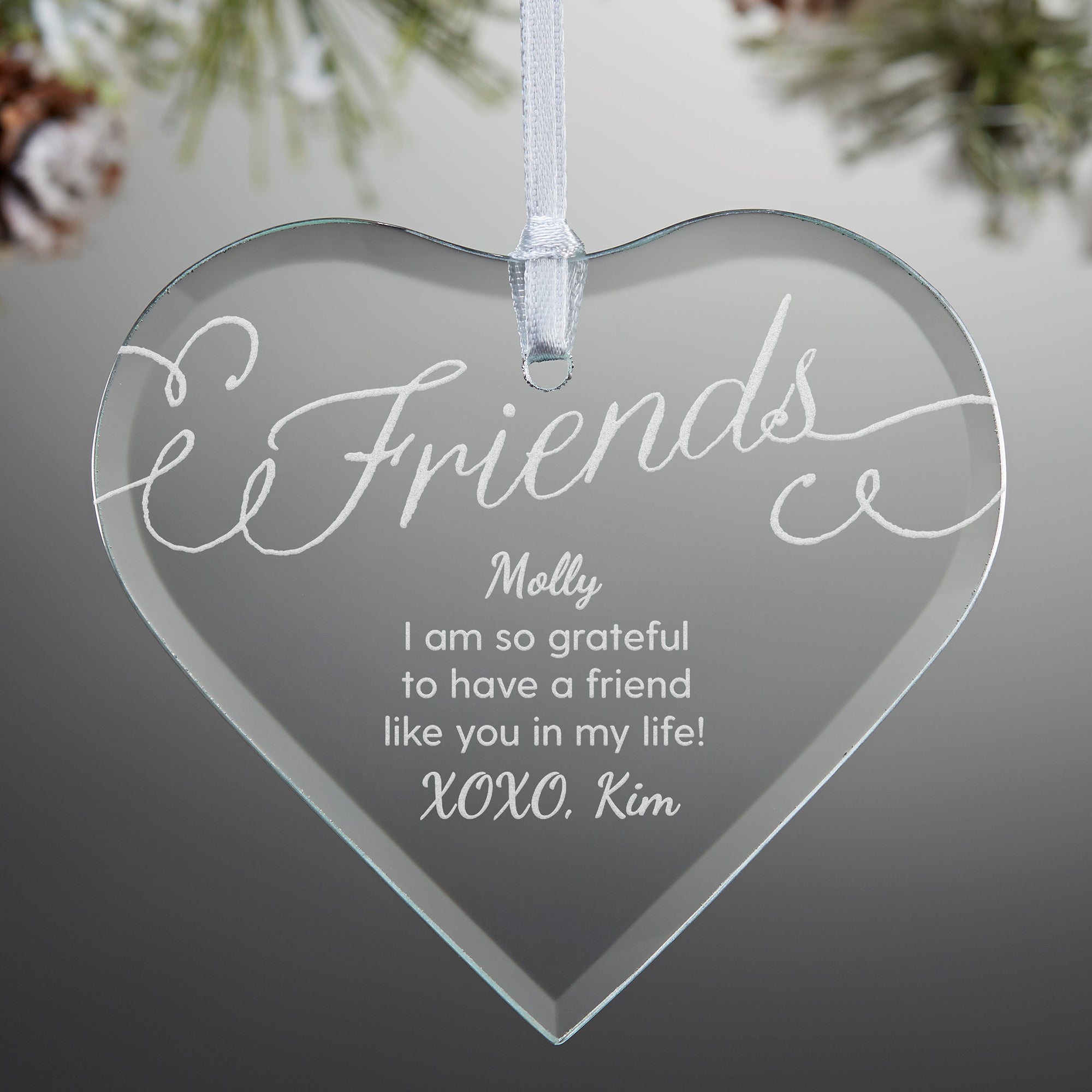 Capture the joy of your Friends-mas with the Friends Forever Personalized Heart Ornament displayed on your tree.