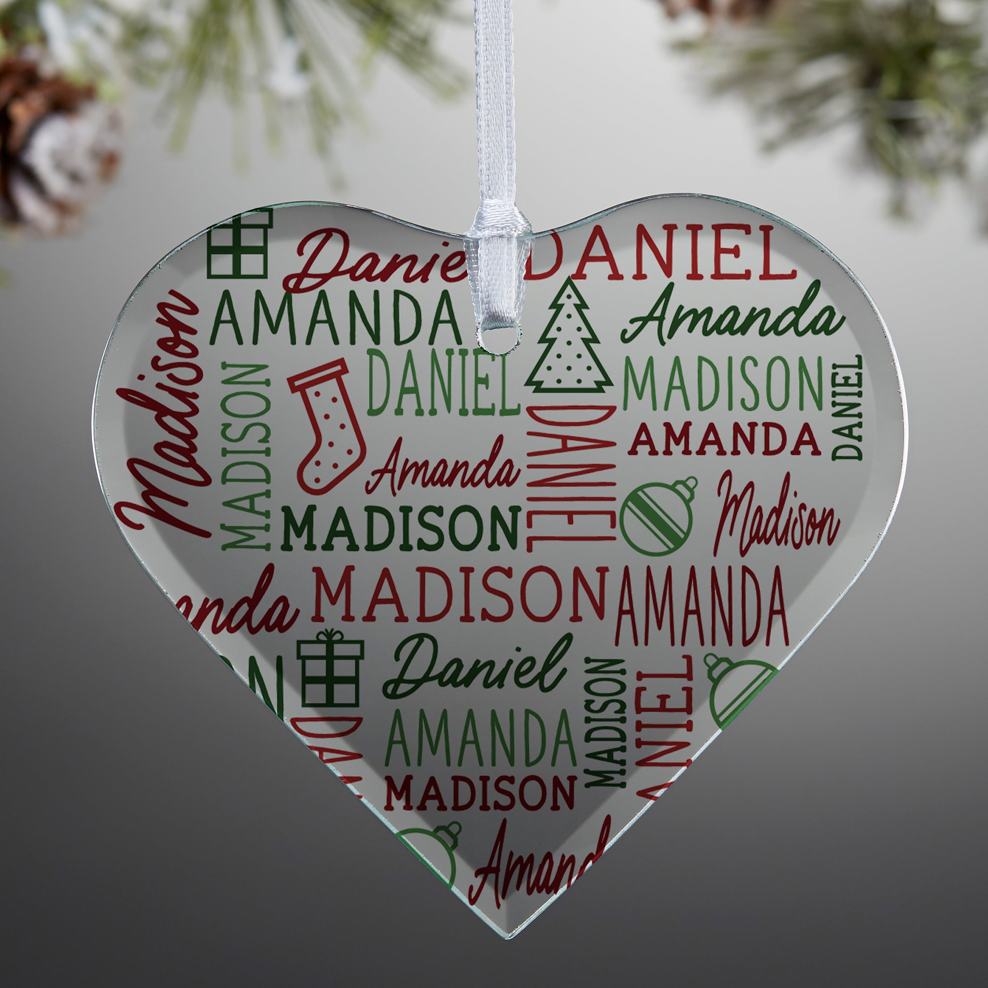 Choose our Holiday Repeating Name Personalized Glass Heart Ornament for that perfect family on your list, listing every member of their family on a delicate heart ornament.