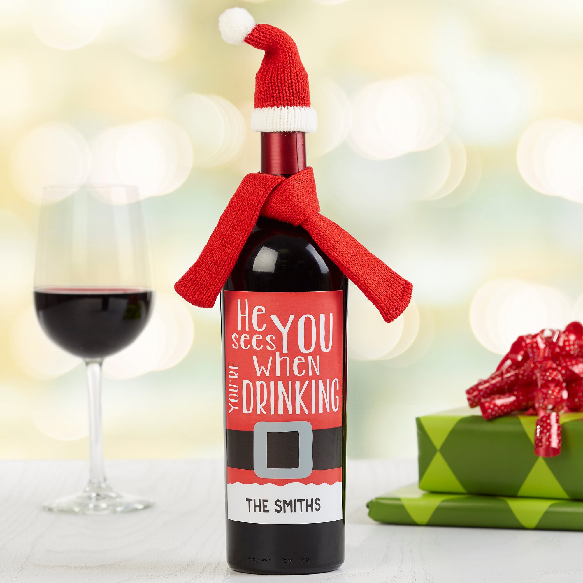 Dress up your bottled beverages at your holiday gathering with our He Sees You When You're Drinking Personalized Wine Bottle Label.