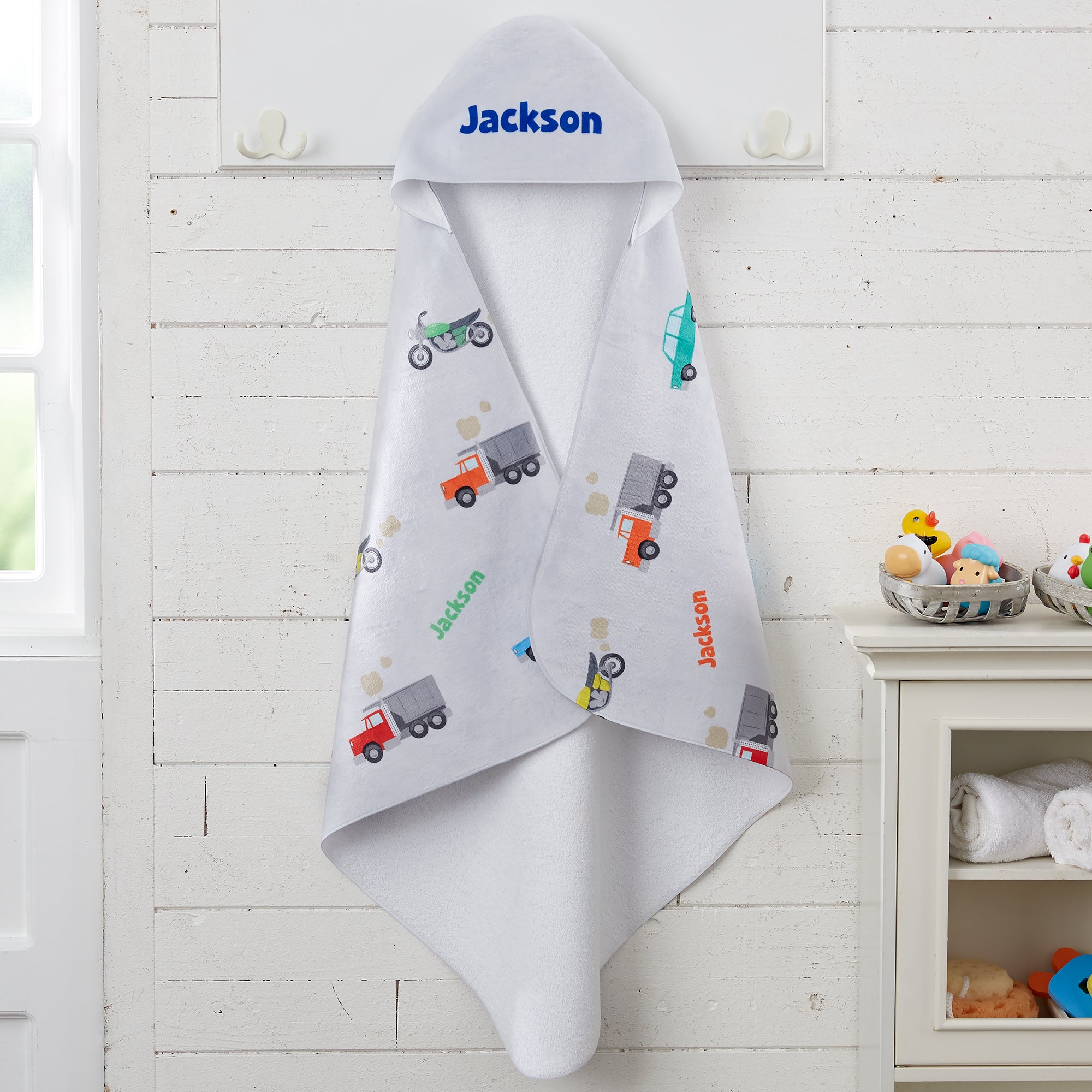 Our Modes of Transportation Personalized Baby Hooded Towel will soak up all the suds to make your little one warm and dry as quick as possible. This personalized baby hooded towel makes for a fun bath piece for home, beach or pool side.