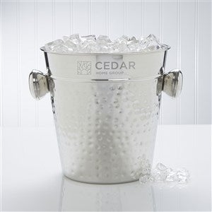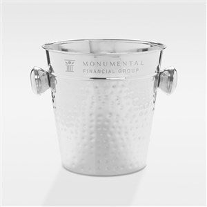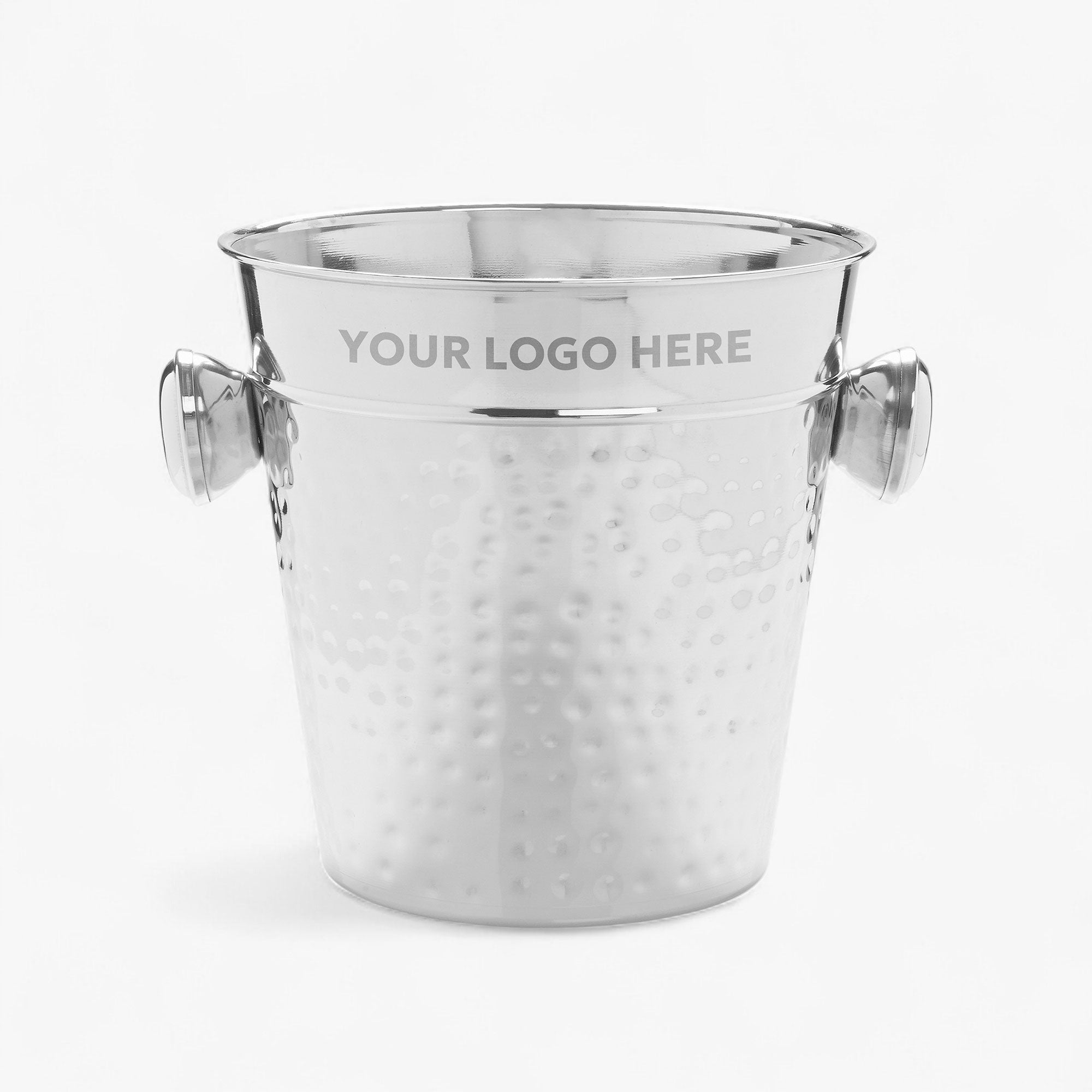 Crafted from stainless steel with handsome hand-hammered details and rolled edges, this custom logo ice bucket & chiller is great for corporate event planning, retirement parties, restaurants, and hotels.This watertight, waterproof bucket resists rusting and tarnishing— making it a great corporate gift idea for clients, employees, executives, and restaurant owners.