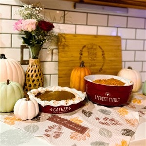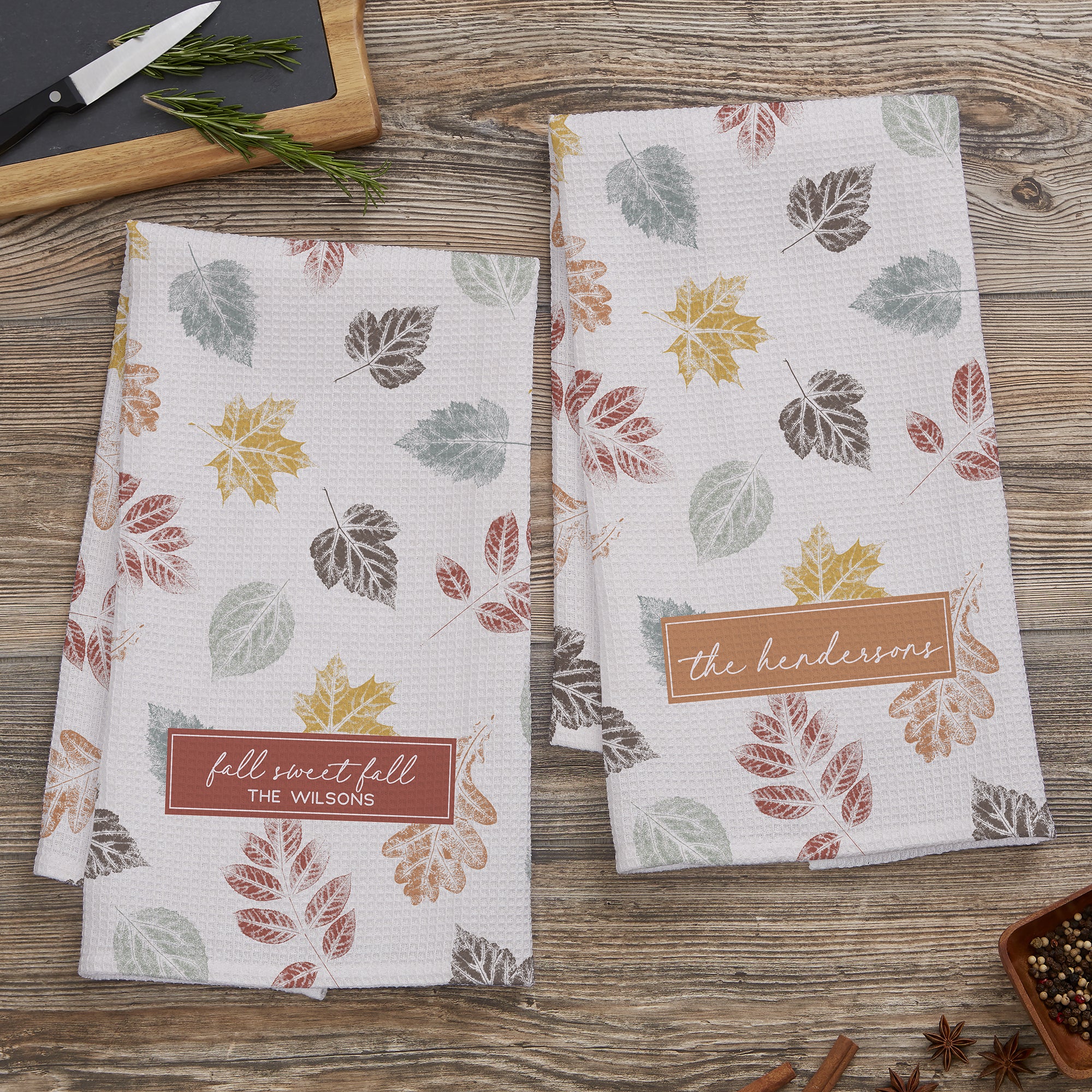 The Stamped Leaves Personalized Kitchen Towel is the perfect festive towel for any kitchen this fall season.