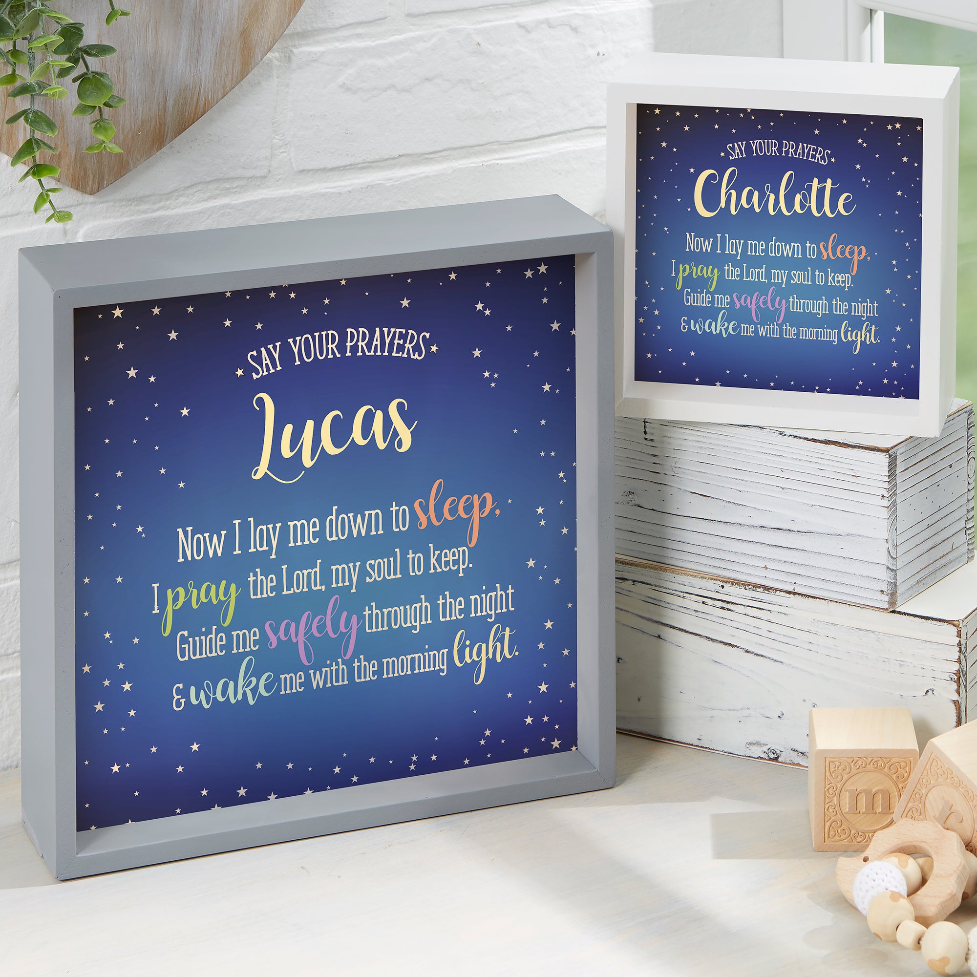 Add a touch of light to your child's room with our Bedtime Prayer Personalized LED Light Shadow Box. The wood box frame holds a sweet bedtime prayer and is perfect for any shelf in their room to add a soft light in the dark.