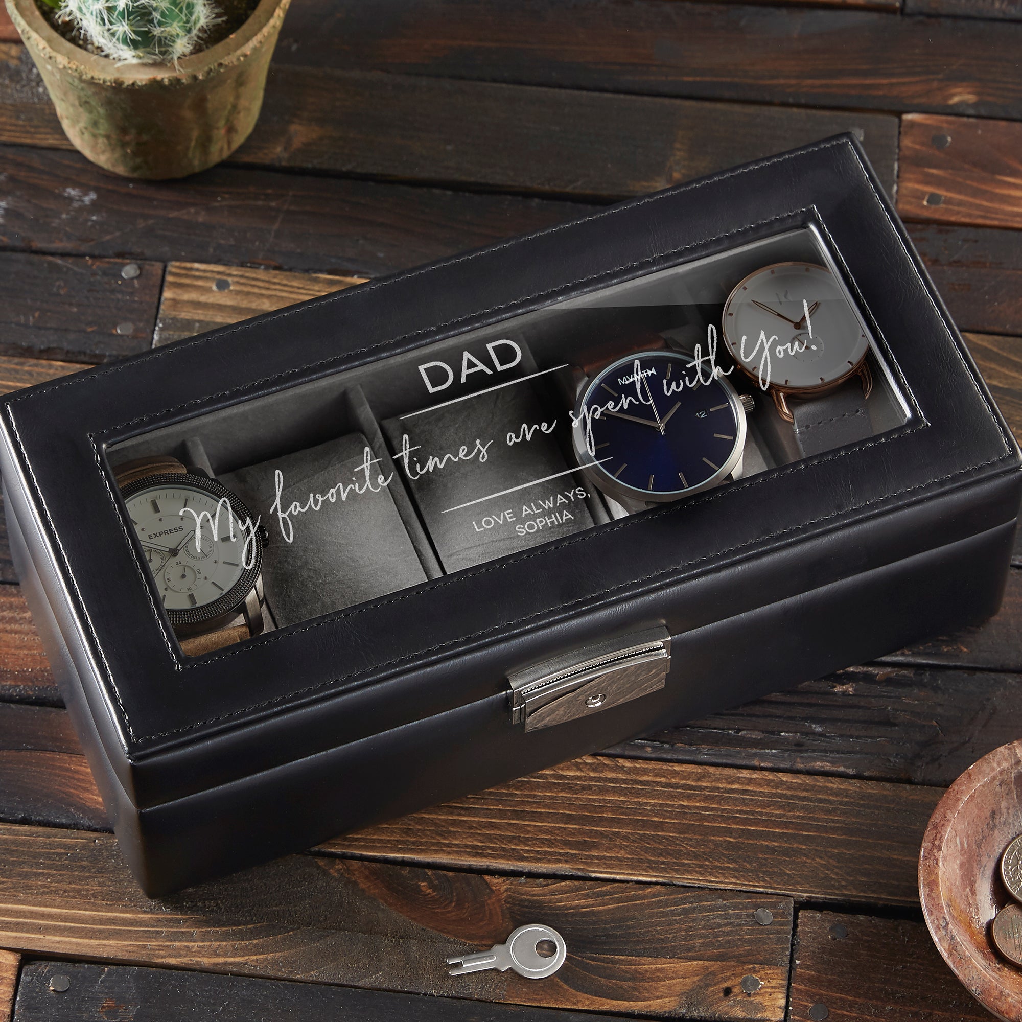 Give dad a gift he is sure to love with our Message to Dad Personalized Vegan Leather Watch Box. Available in two sizes, this watch box features a sentimental message and provides a great place to store his watches and accessories.