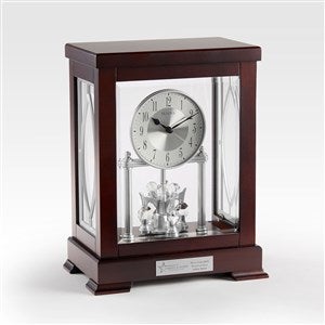 The Engraved Logo Bulova Empire Crystal Pendulum Clock mixes modern lines with an elegant chandelier style pendulum that rotates to show off its eight crystals. This unique clock makes for a wonderful high-end gift for your boss, or for a retiring colleague. Engraved on the lower, silver plaque on the clock body.