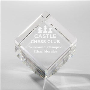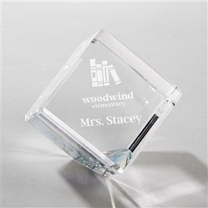 - Crystal cube paperweight that is engraved on the back side and shows through to the front