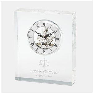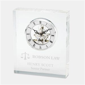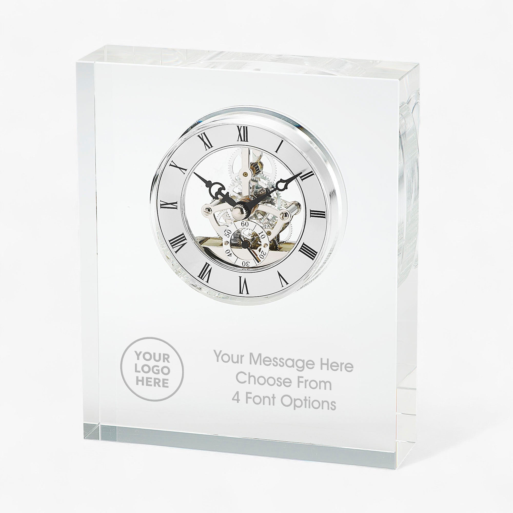 Award the Personalized Logo Crystal Skeleton Desk Clock to your hardworking employees. Custom engraved with any name, logo, and/or text, this item is the perfect way to celebrate milestones or a work anniversary.